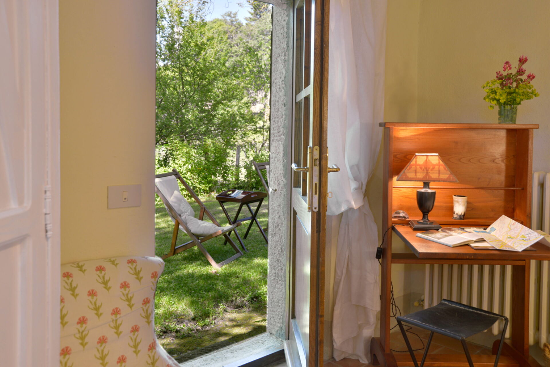 Slaapkamer 1: tweepersoonsbed, WIFI internet, uitgang naar de tuin.