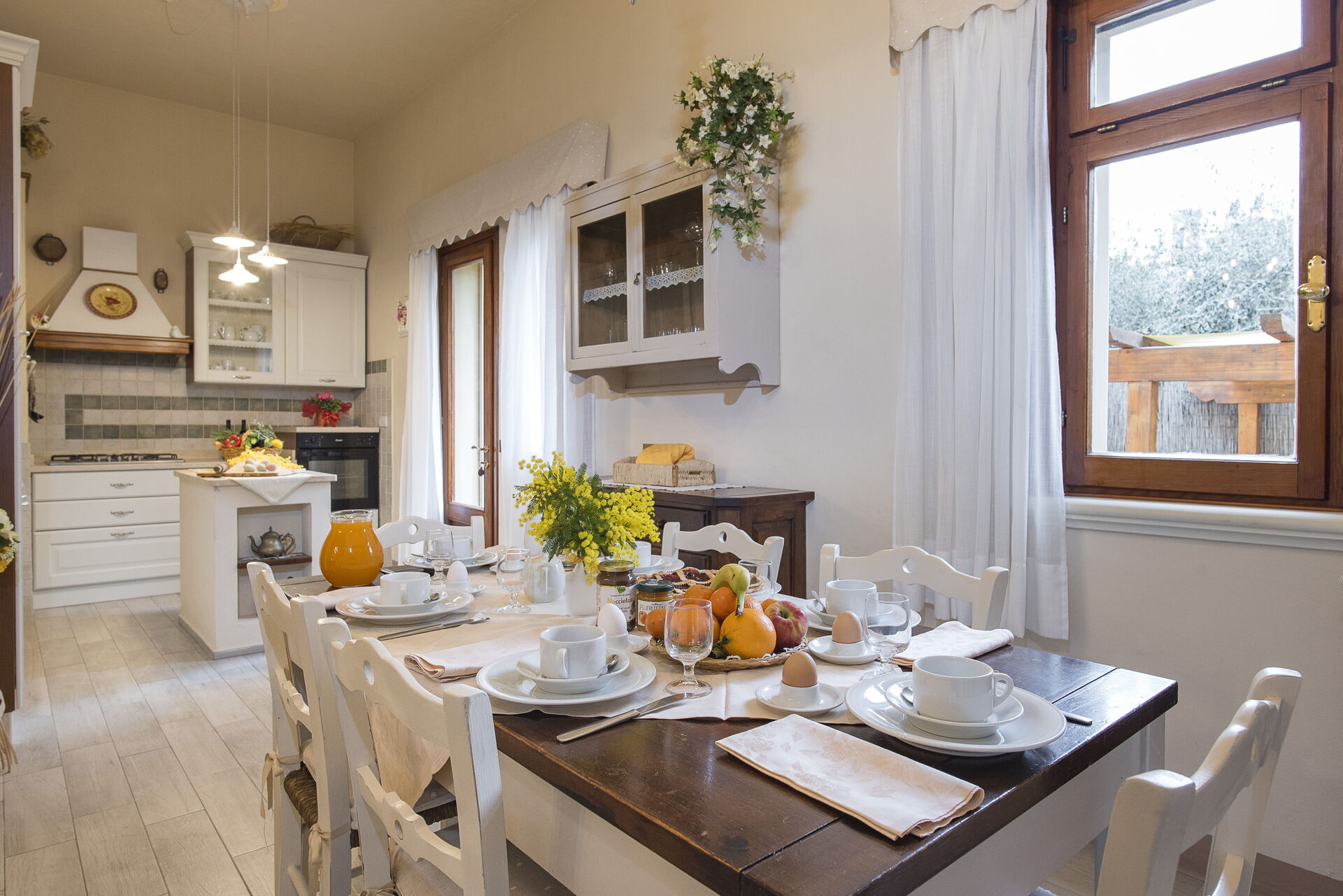 Keuken: goed uitgeruste keuken, eettafel (personen: 6), vaatwasser, twee ijkasten, twee diepvriezers, magnetron, kookplaat, oven, broodrooster, strijkijzer, koffiezetapparaat, wasmachine, WIFI internet, hor, kinderstoel, uitgang naar de tuin.