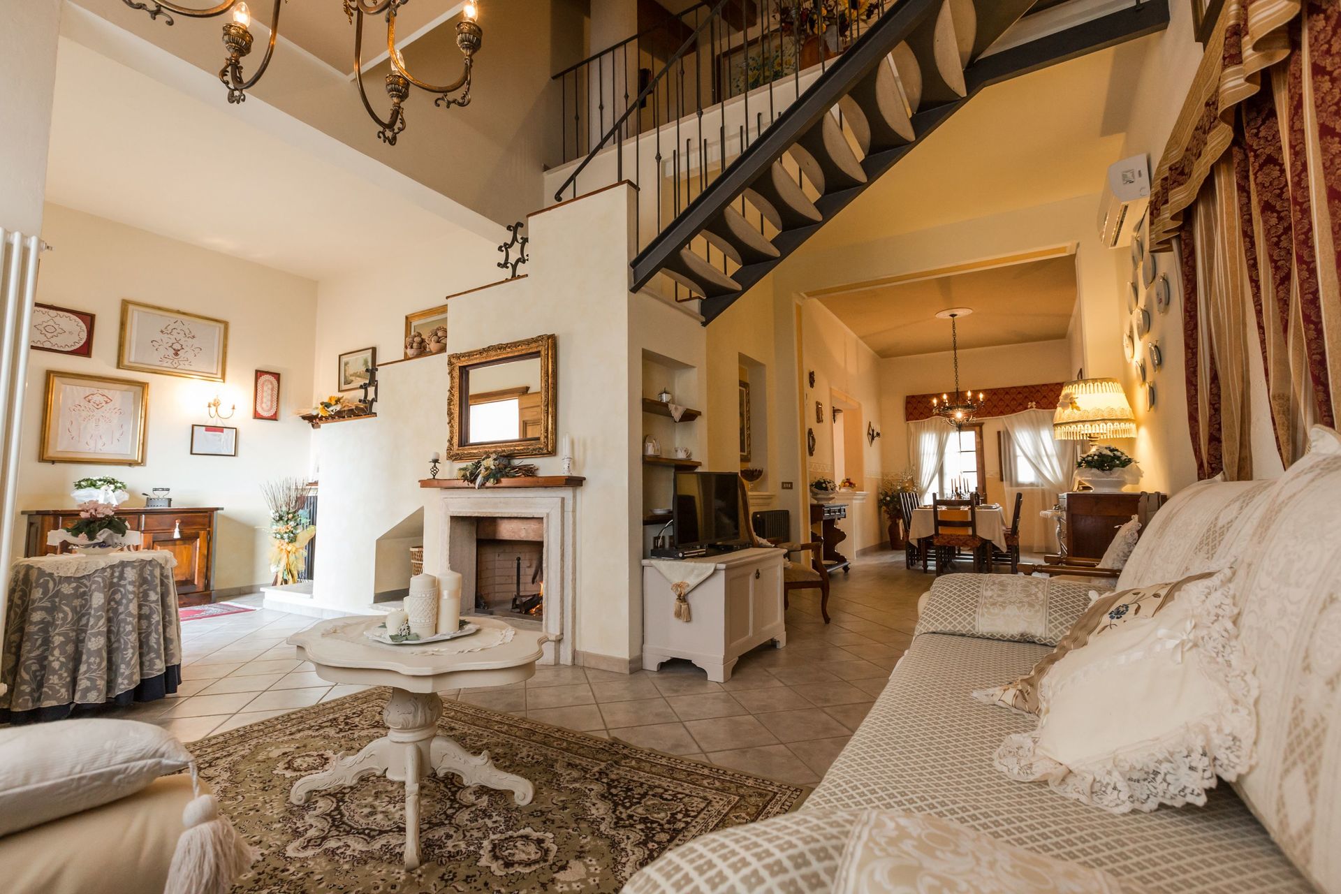 Open ruimte: twee banken (personen: 8), twee fauteuils, open haard, eettafel (personen: 8), WIFI internet, airconditioning, tv, hor, uitgang naar de tuin, vide.