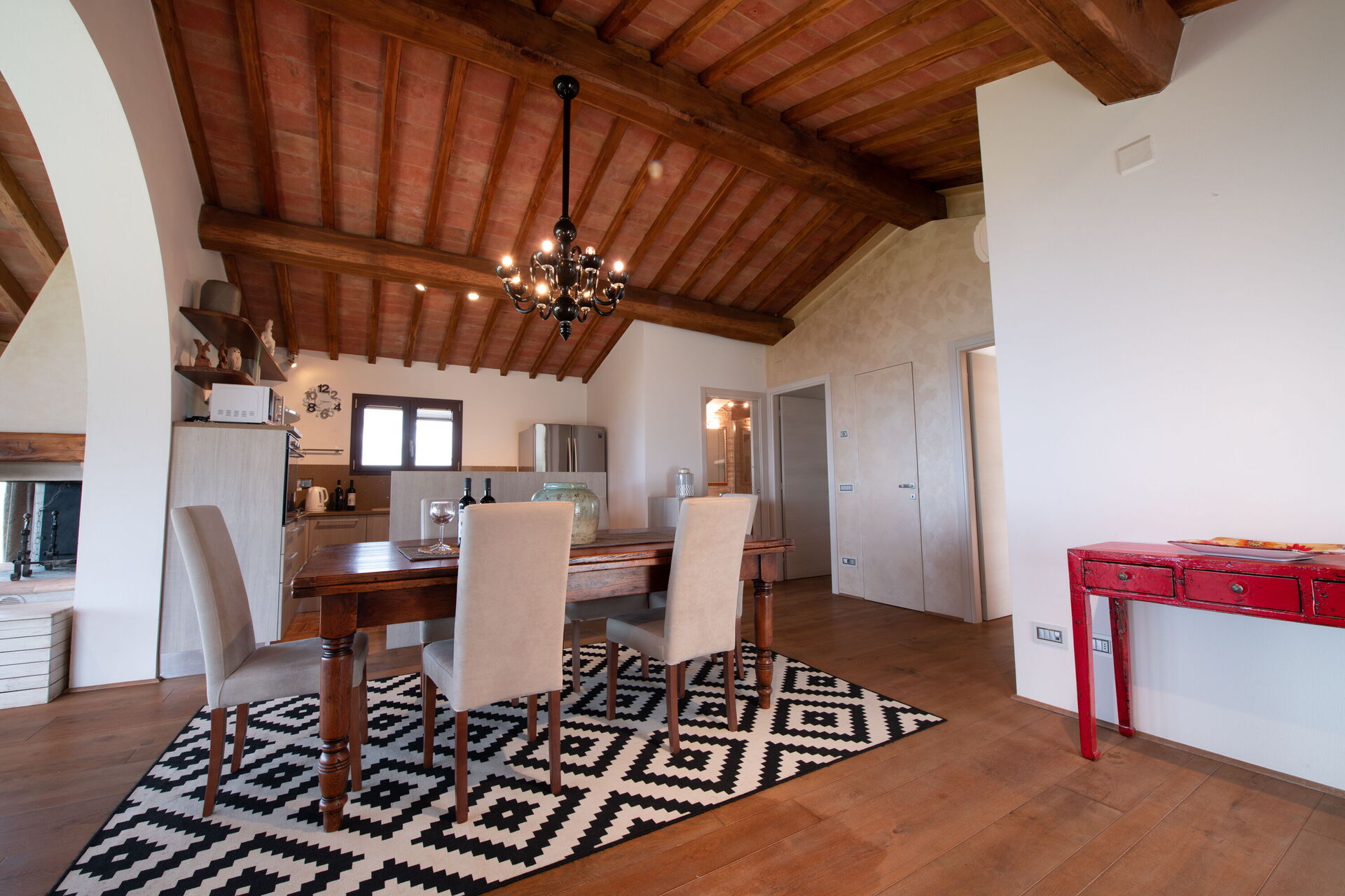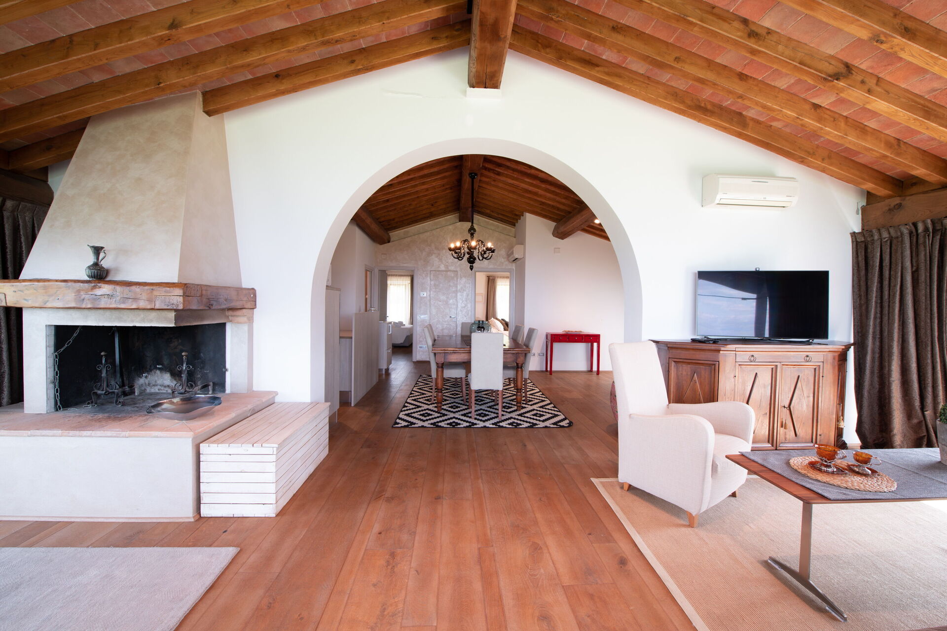Keuken – woonkamer: goed uitgeruste keuken, eettafel, vaatwasser, ijskast, diepvriezer, magnetron, kookplaat, oven, broodrooster, italiaans koffiezetapparaat, koffiezetapparaat, bank, open haard, WIFI internet, airconditioning, hor, satelliet tv, tv, stereo , uitgang naar het terras.