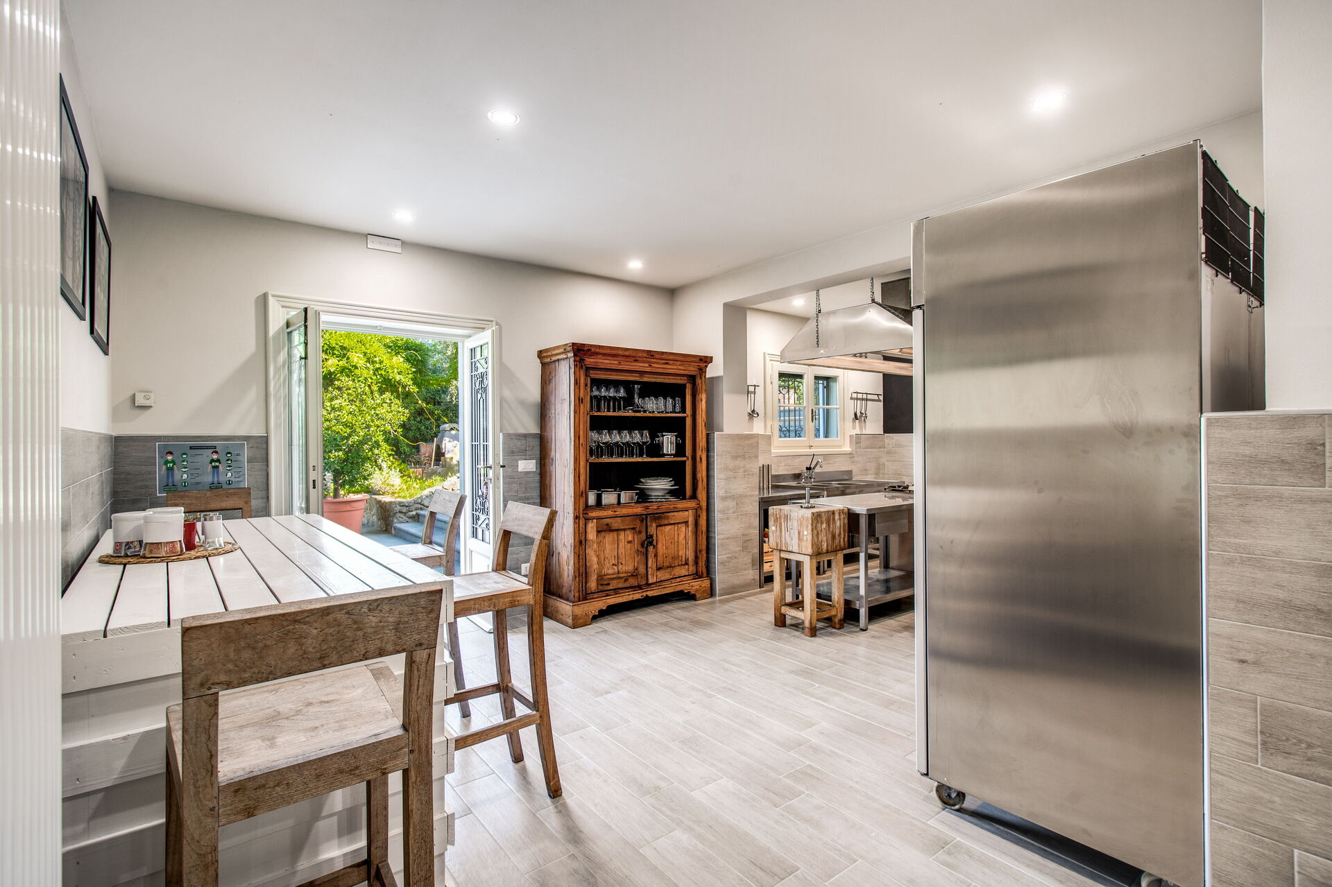 Keuken (9 m2): goed uitgeruste keuken, vaatwasser, ijskast, diepvriezer, magnetron, kookplaat, oven, broodrooster, italiaans koffiezetapparaat, koffiezetapparaat, uitgang naar het terras.
