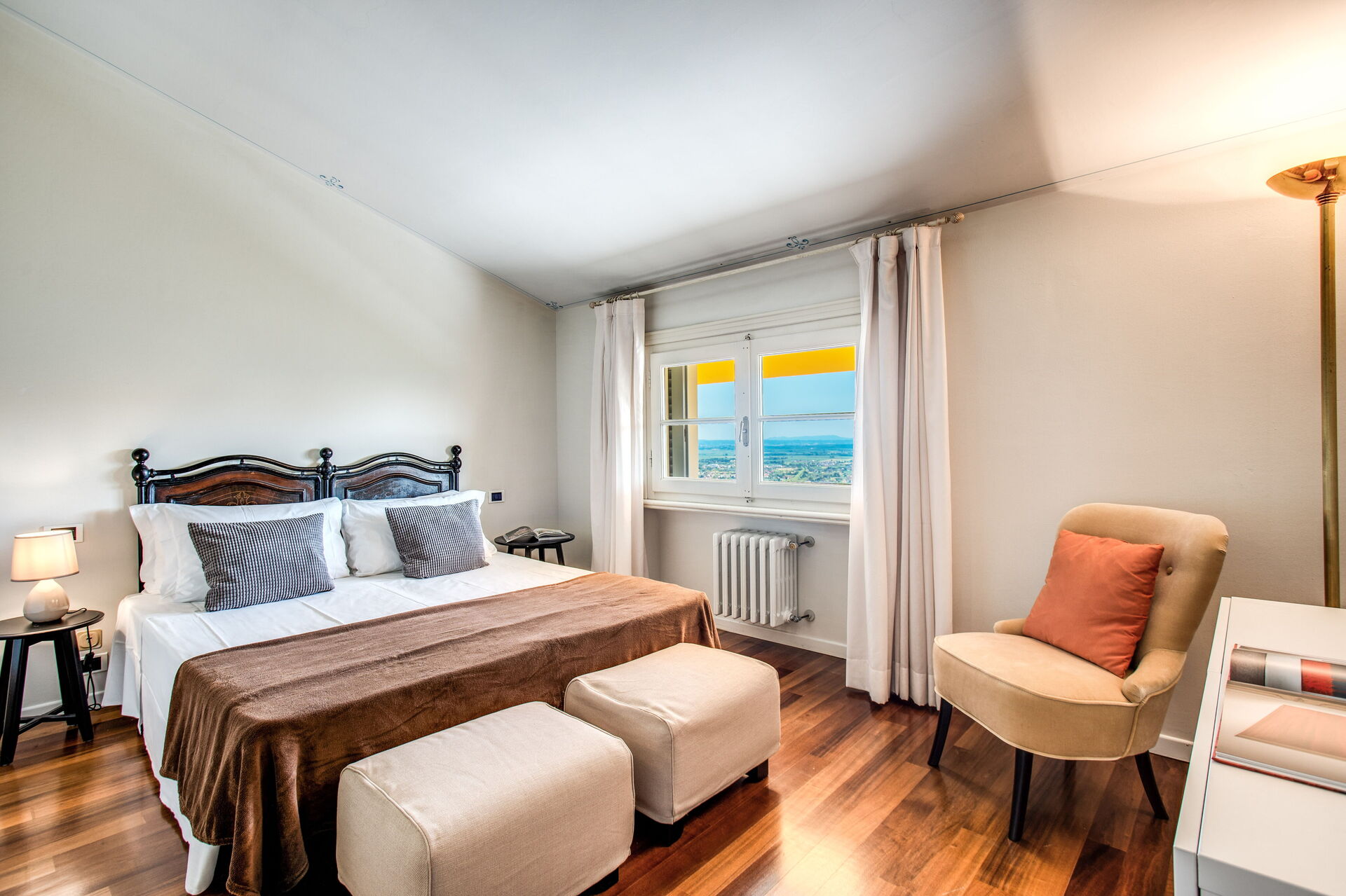 Slaapkamer met badkamer (60 m2): king size bed (breedte: 2m, lengte: 2.1m), WIFI internet, airconditioning, satelliet tv, fauteuil, bureau, wastafel, toilet , bidet, douche, haardroger, uitgang naar de patio.