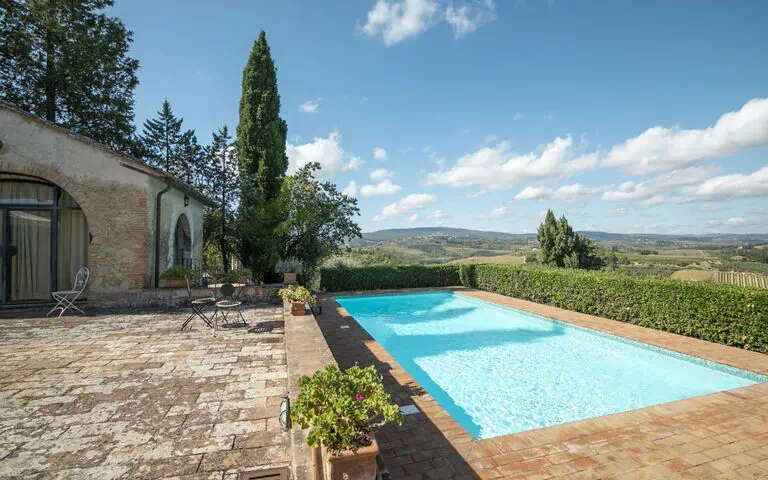 "Vedi Torre" is een gerestaureerd landhuis uit de 18de eeuw, gelegen op een heuvel in het Casaglia-district van Poggibonsi in Italië. Het pand werd in 2004 gerenoveerd en bestaat uit 2 appartementen die van buiten met elkaar verbonden zijn. Het huis ligt omgeven door open velden en oude bomen en biedt een panoramisch uitzicht over het Toscaanse landschap. De accommodatie beschikt over een privépark en tuin, alsmede een zwembad.