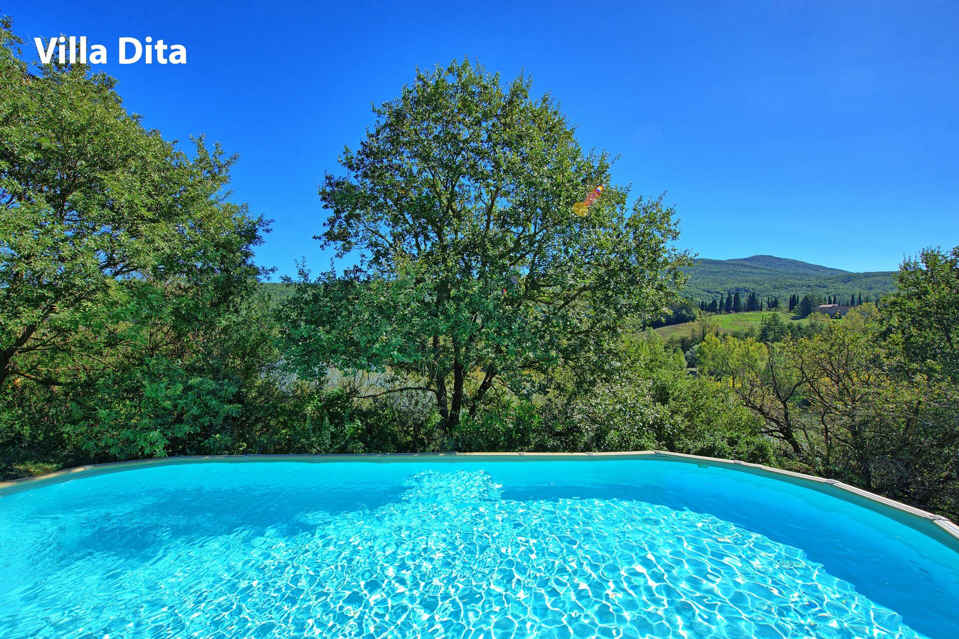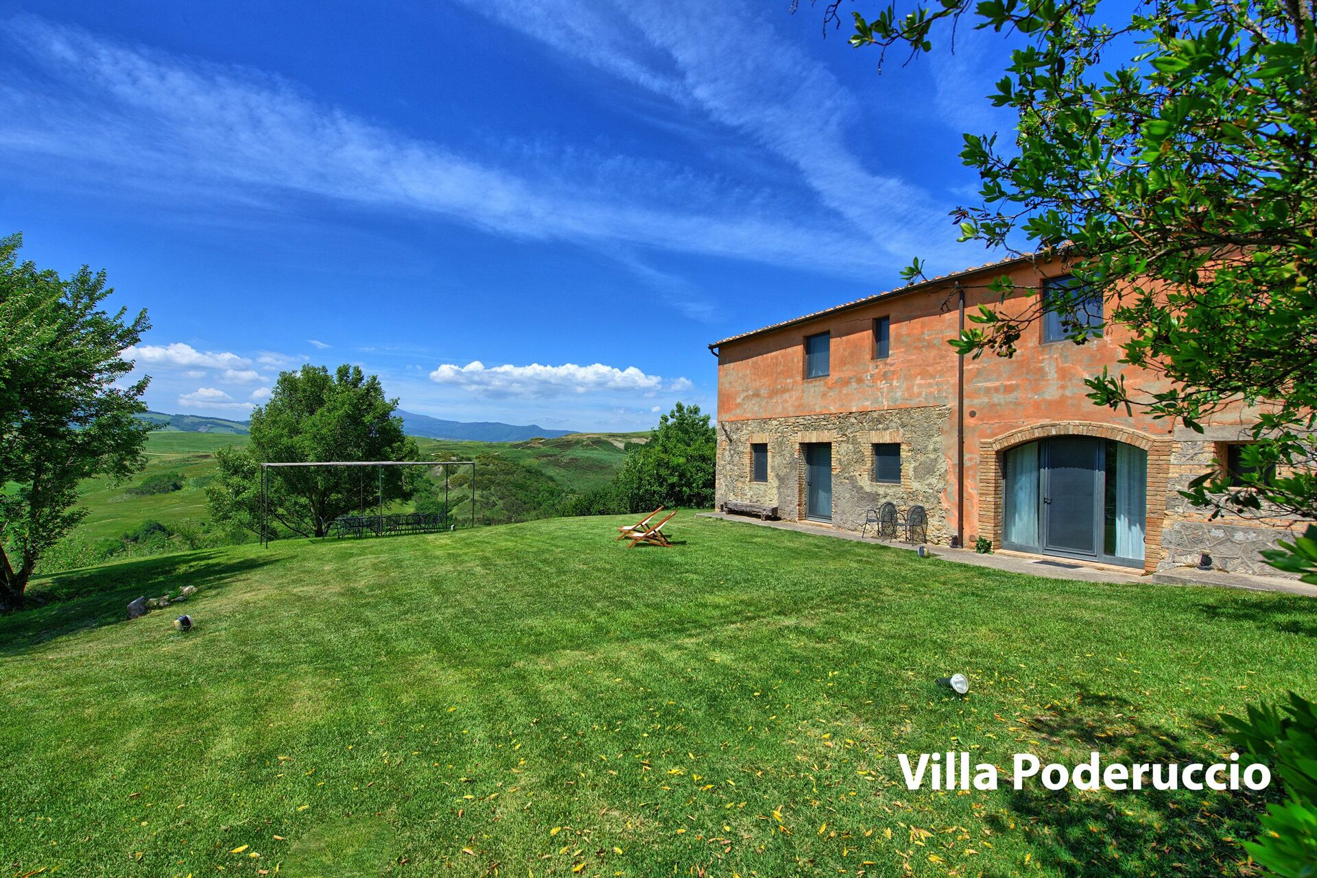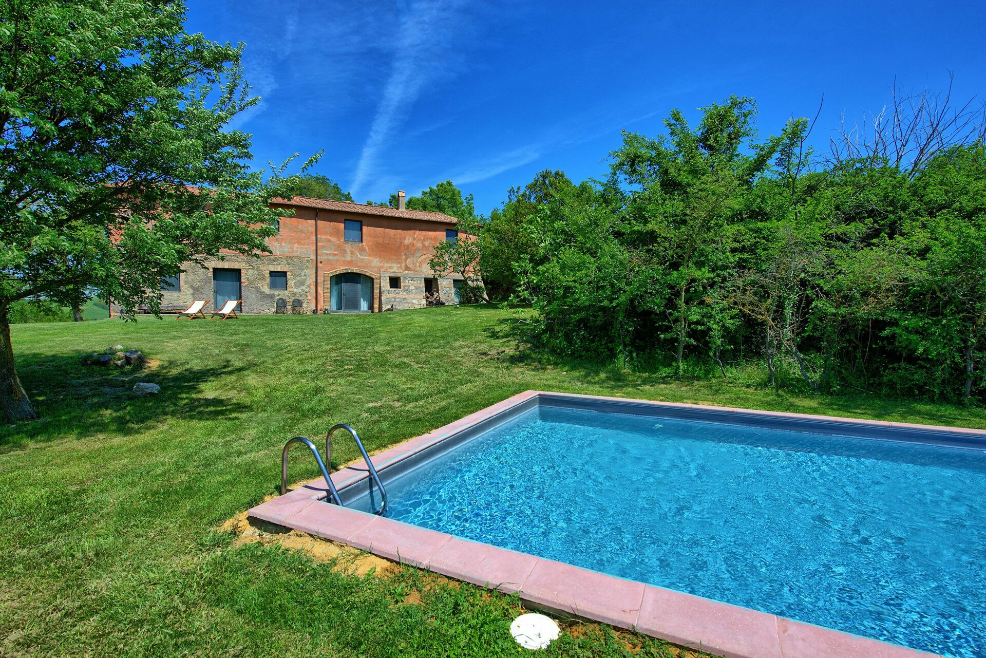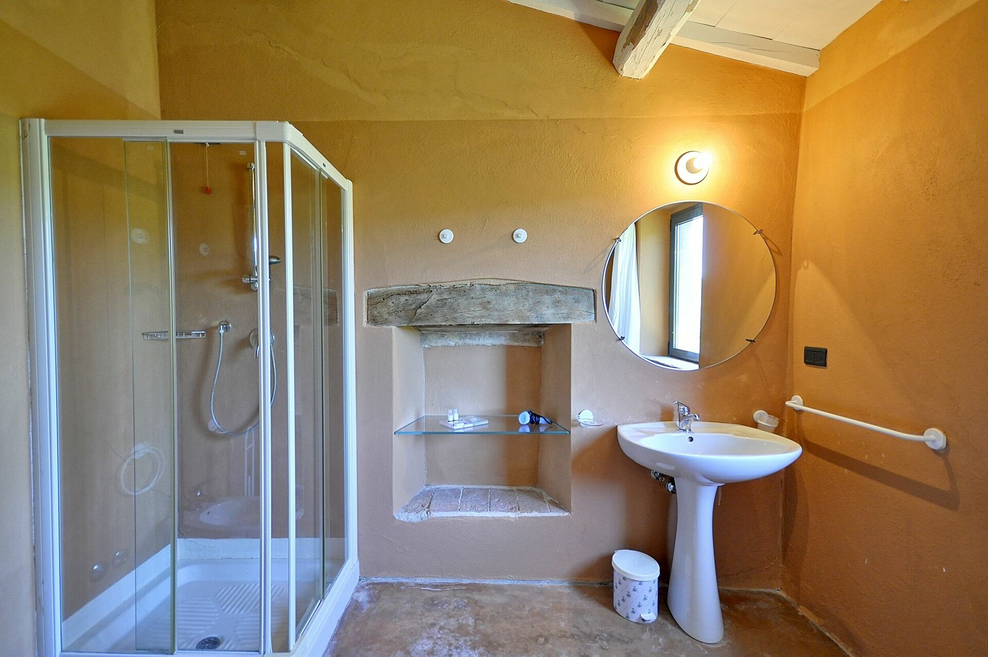 Begane grond: ingang in een grote open ruimte met woongedeelte, gemeubileerd met banken en leunstoelen, ruim eetgedeelte met een grote houten tafel voor een mooie werkende open haard en een ruime keuken die volledig is uitgerust met een gasfornuis (4 pitten), elektrische oven, magnetron, koffiezet apparaat, waterkoker, broodrooster, vaatwasser. Vanuit de keuken via een grote openslaande deur toegang naar de tuin aan de zwembadkant. Op dezelfde verdieping bevinden zich 3 slaapkamers, de eerste heeft 2 eenpersoonsbedden (op aanvraag bij elkaar te zetten), privé badkamer met bad, de tweede slaapkamer heeft 2 eenpersoonsbedden, die ook bij elkaar zijn te zetten, privé badkamer met douche en uitgang naar de tuin, de derde slaapkamer heeft twee “Franse “bedden, directe uitgang naar de tuin en privé badkamer met douche.