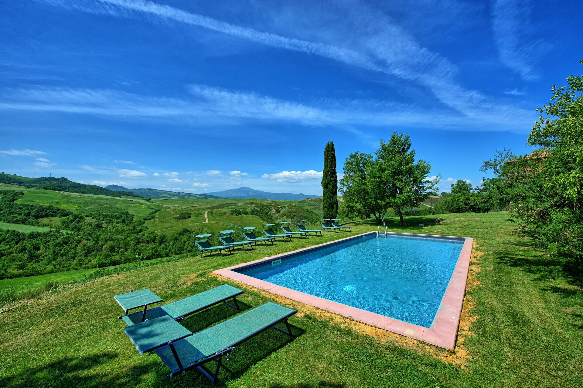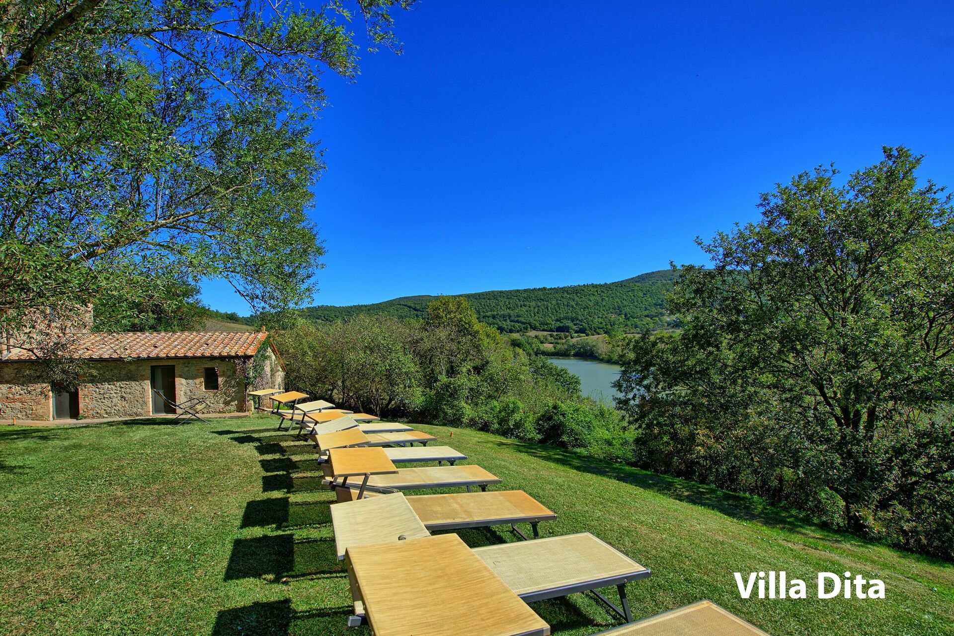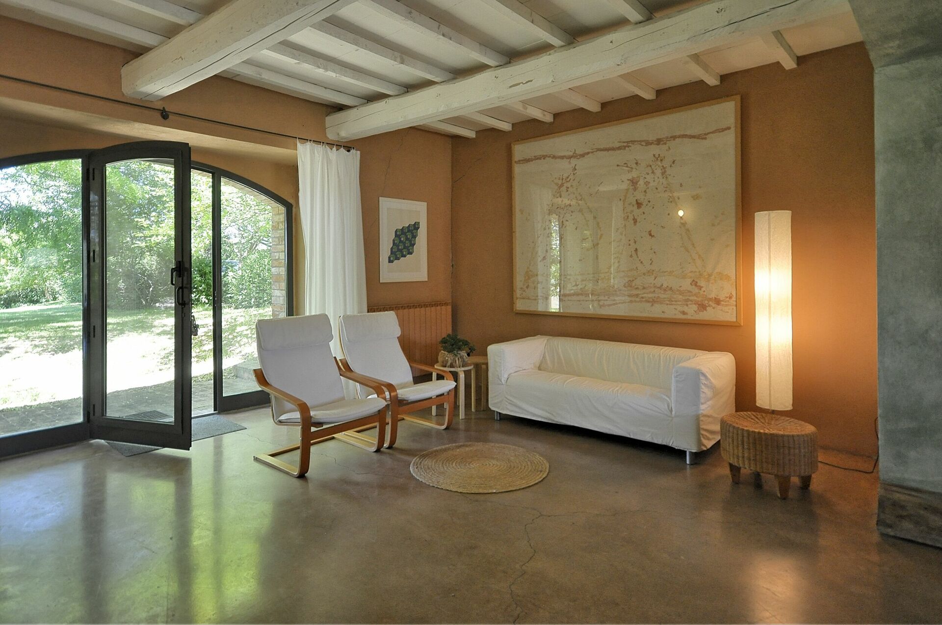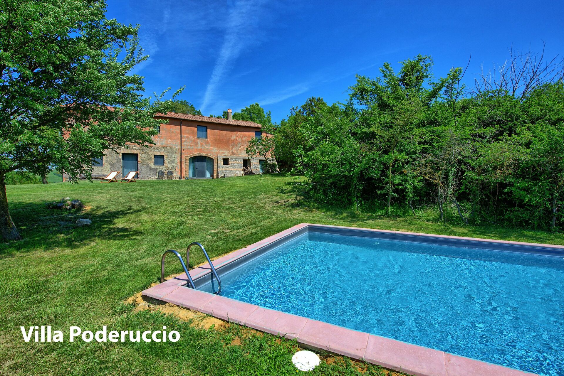 Begane grond: ingang in een grote open ruimte met woongedeelte, gemeubileerd met banken en leunstoelen, ruim eetgedeelte met een grote houten tafel voor een mooie werkende open haard en een ruime keuken die volledig is uitgerust met een gasfornuis (4 pitten), elektrische oven, magnetron, koffiezet apparaat, waterkoker, broodrooster, vaatwasser. Vanuit de keuken via een grote openslaande deur toegang naar de tuin aan de zwembadkant. Op dezelfde verdieping bevinden zich 3 slaapkamers, de eerste heeft 2 eenpersoonsbedden (op aanvraag bij elkaar te zetten), privé badkamer met bad, de tweede slaapkamer heeft 2 eenpersoonsbedden, die ook bij elkaar zijn te zetten, privé badkamer met douche en uitgang naar de tuin, de derde slaapkamer heeft twee “Franse “bedden, directe uitgang naar de tuin en privé badkamer met douche.