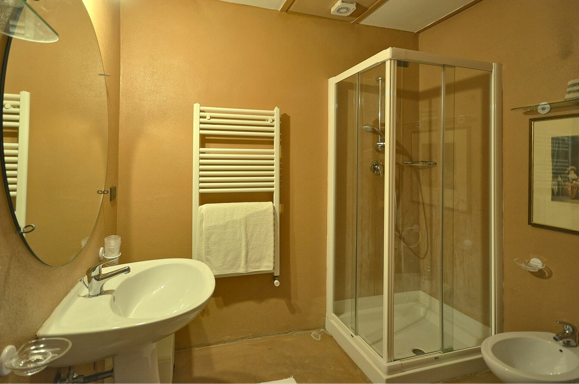 Eerste verdieping: via een wenteltrap komt men op de eerste verdieping met een gemeenschappelijke kamer die is gemeubileerd met banken en TV. Er zijn vier slaapkamers, twee met 2 eenpersoonsbedden( tot één bed te maken), elk met een eigen badkamer, de andere twee hebben twee “Franse” bedden en een privé badkamer met douche.