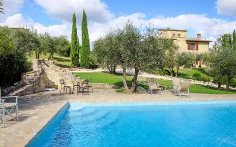 Mooi, comfortabel landhuis "Roseto", vrijstaand, omgeven door bomen, weiden en velden. 3 huizen in de plaats. 4 km van het centrum van Collazzone, 14 km van het centrum van Todi, 40 km van het meer, te midden van groen. Voor alleengebruik: terrein 3.000 m2 met gazon en bomen, ligweide, openluchtzwembad (12 x 6 m, 150 cm diepte, 02.05.-26.09.). Buitendouche. In het complex: sauna, fitnessruimte (extra). Massage (extra). Stoombad (extra). Bubbelbad (extra). Fietsverhuur. Kok op verzoek (extra). Parkeerplaats (voor 2 auto's). Supermarkt 2.5 km. Bekende meren kunnen gemakkelijk worden bereikt: Lago di Trasimeno 40 km. Let op: auto noodzakelijk. Geschikt voor evenementen. De eigenaar accepteert geen jeugdgroepen. Lokale verkoop van streekproducten. Object referentie: 615.1,616.1 is gelegen op hetzelfde terrein.