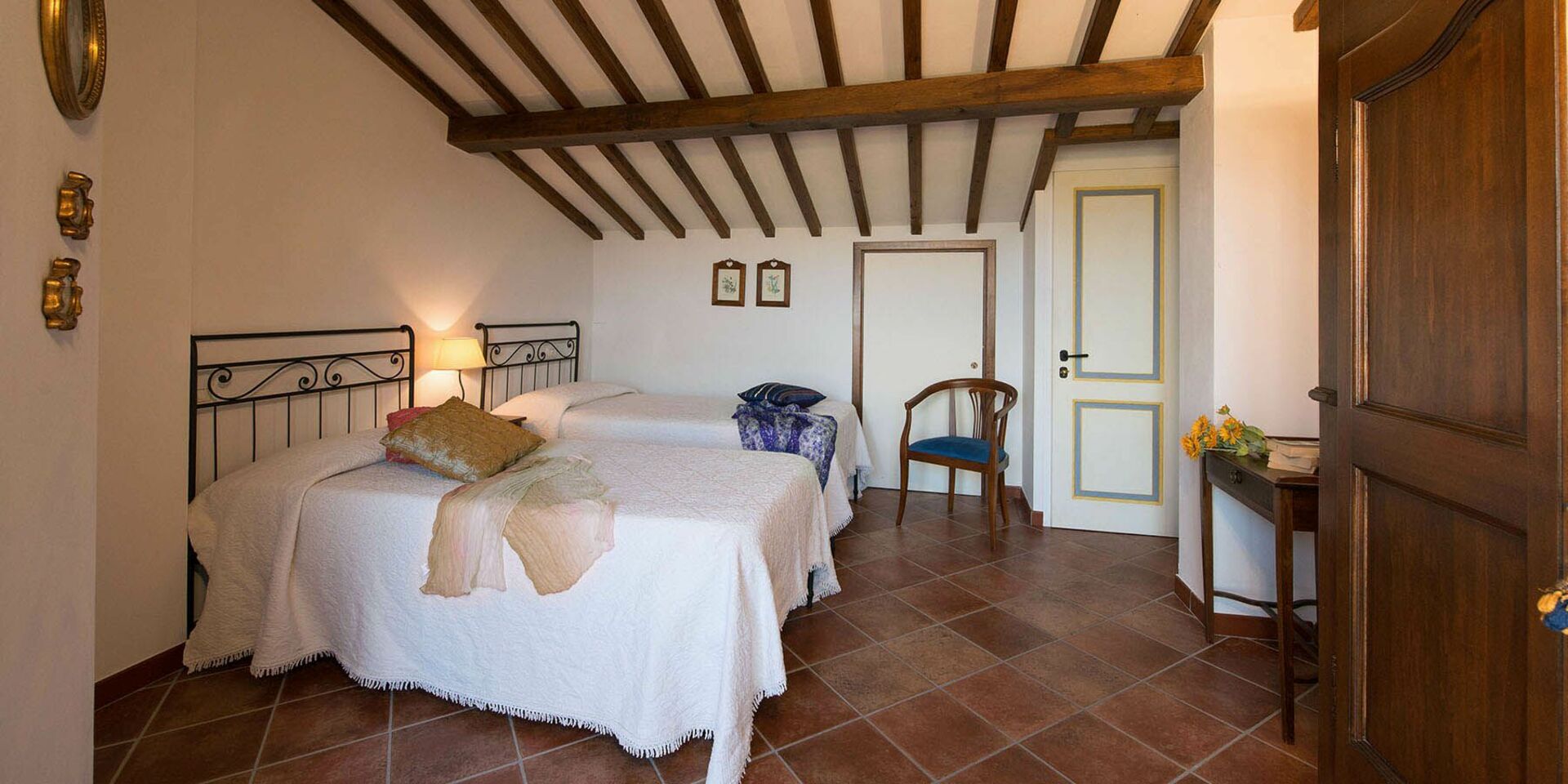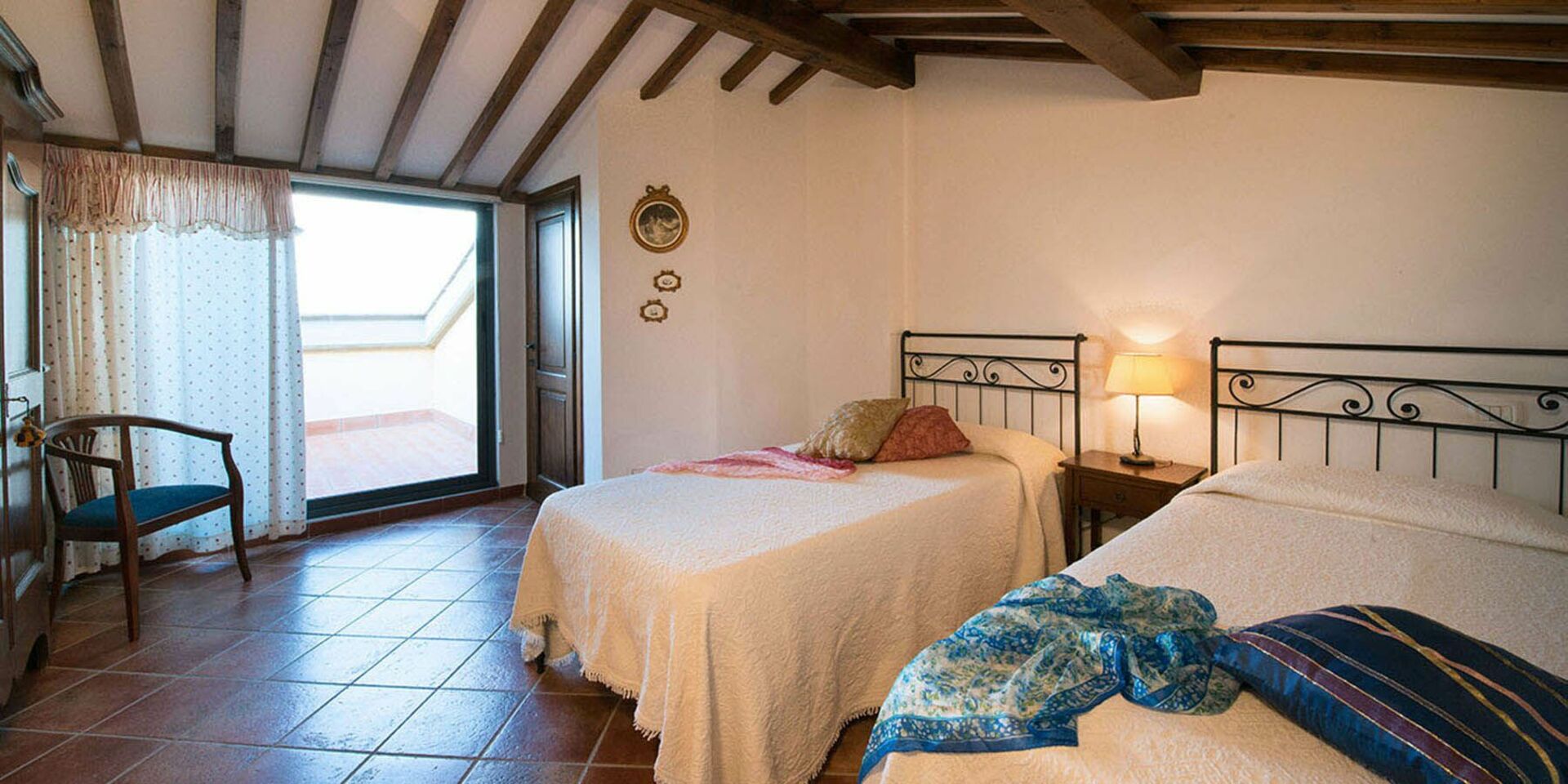 First floor: bedroom with two single beds and access to the terrace, bathroom with shower.