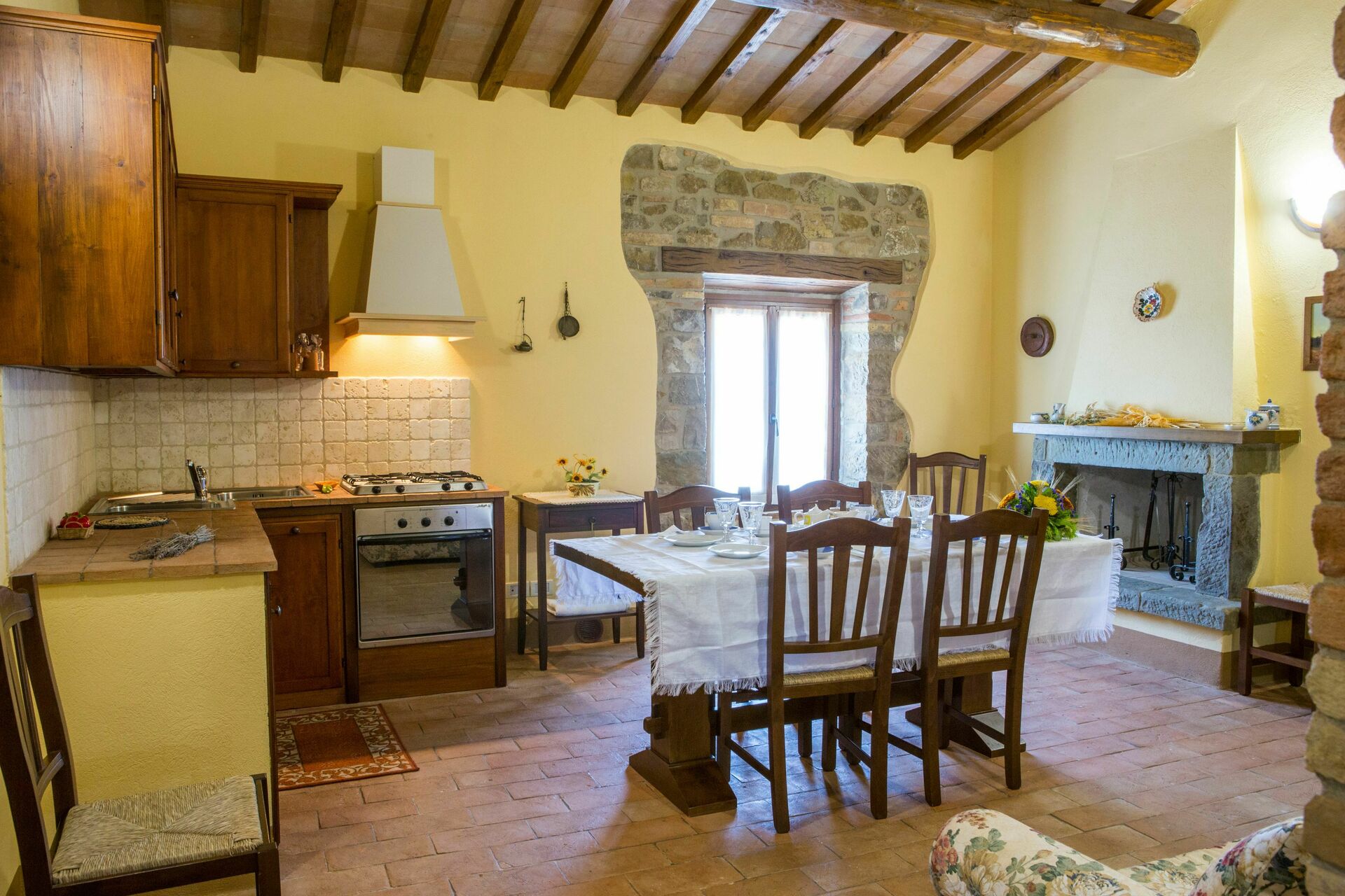 Keuken – woonkamer 1: goed uitgeruste keuken, eettafel, ijskast, diepvriezer, kookplaat, oven, bank, open haard, WIFI internet, satelliet tv, uitgang naar de tuin.