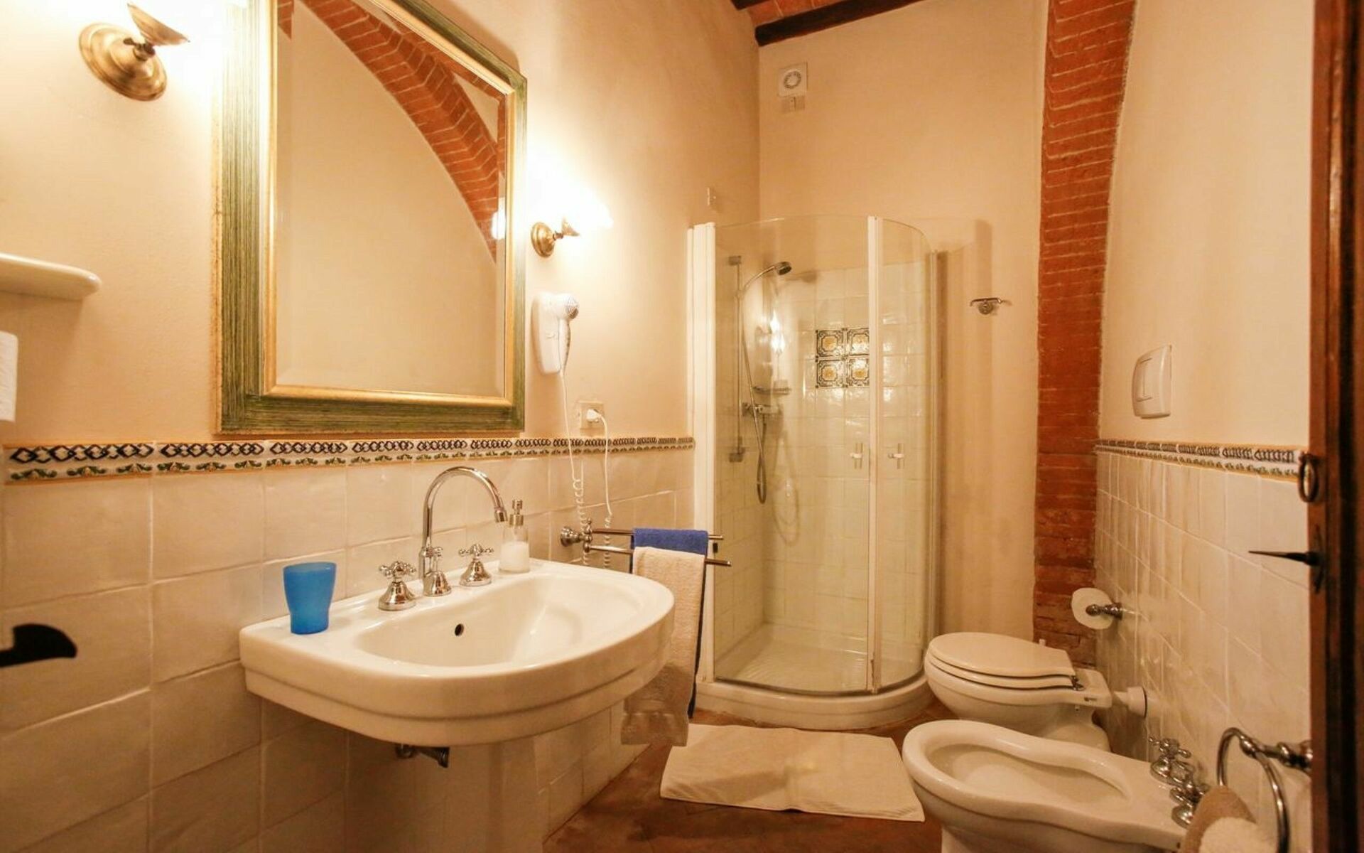 Badkamer: wastafel, toilet , bidet, douche, haardroger.