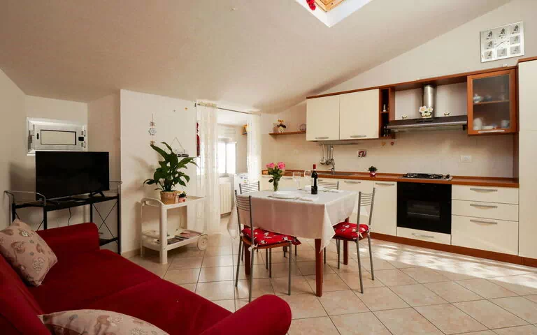 "Stefi", appartement 3-kamers 55 m2 op de 2e verdieping. Licht, afgeschuinde daken, comfortabel en gezellig ingericht: woon-/eetkamer met eettafel en TV (Flatscreen TV), air-conditioning. 1 2-pers. kamer met TV (Flatscreen TV), air-conditioning. 1 kamer met 2 bedden (80 cm). Open keuken (oven, afwasmachine, 4 kookpitten (vlammen), broodrooster, waterkoker, diepvriezer, elektrische koffiemachine). Douche/bidet/WC. Elektrische verwarming, gas-verwarming. Verwarming alleen beschikbaar van 01.11. tot 15.04. Ter beschikking: wasmachine, strijkijzer, kinderbed tot 2 jaar, haardroger. Internet (WiFi, gratis). Geschikt voor families. Maximaal 1 huisdier/hond toegestaan. Er hoeven geen verplichte extra kosten ter plaatse te worden betaald, behalve de lokale belasting. IT053009C2W6DUVCLE