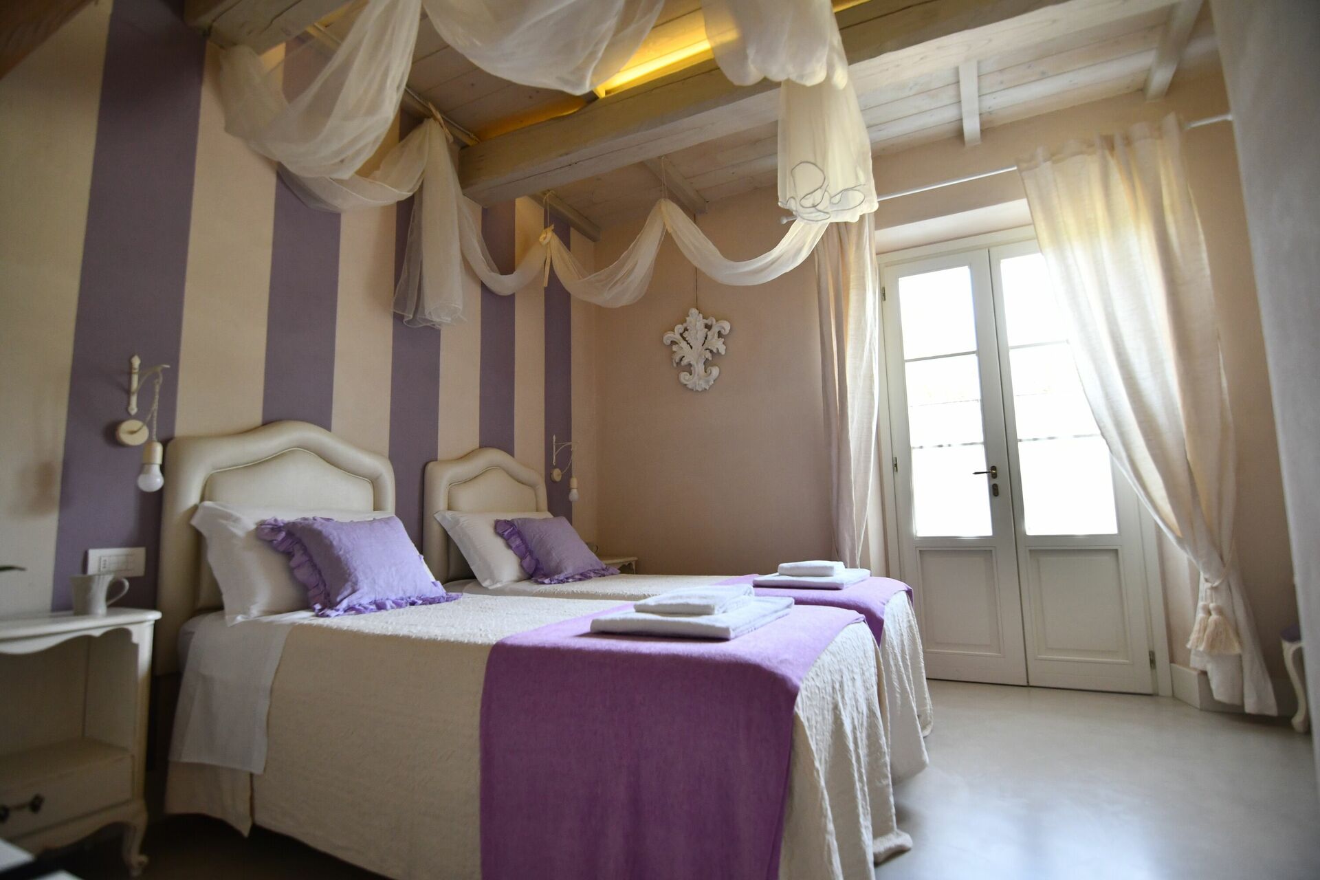 Slaapkamer met badkamer: twee eenpersoonsbedden, WIFI internet, wastafel, toilet , douche, uitgang naar de tuin.