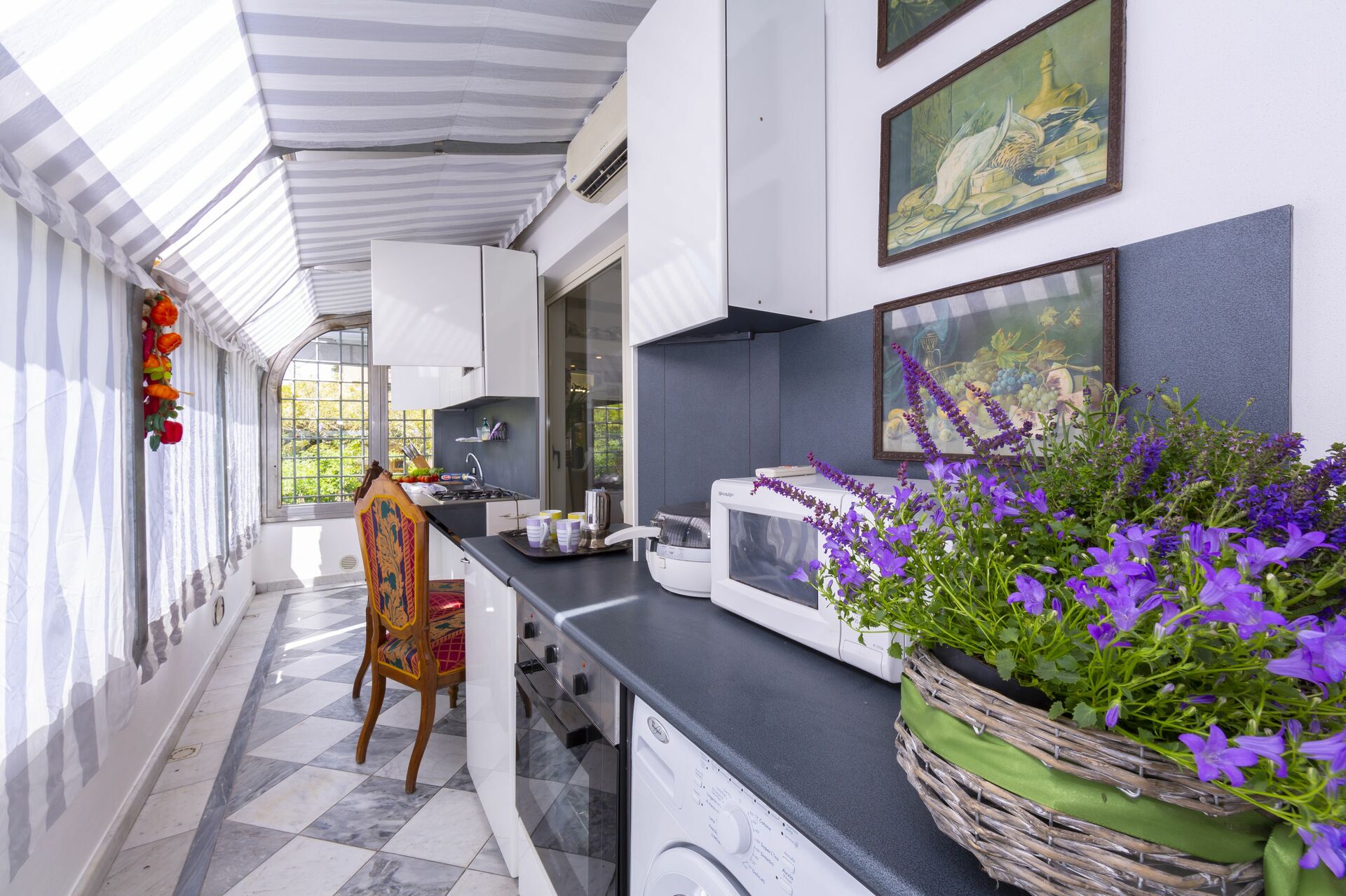 Keuken: vaatwasser, ijskast, diepvriezer, magnetron, kookplaat, oven, broodrooster, wasmachine, airconditioning.