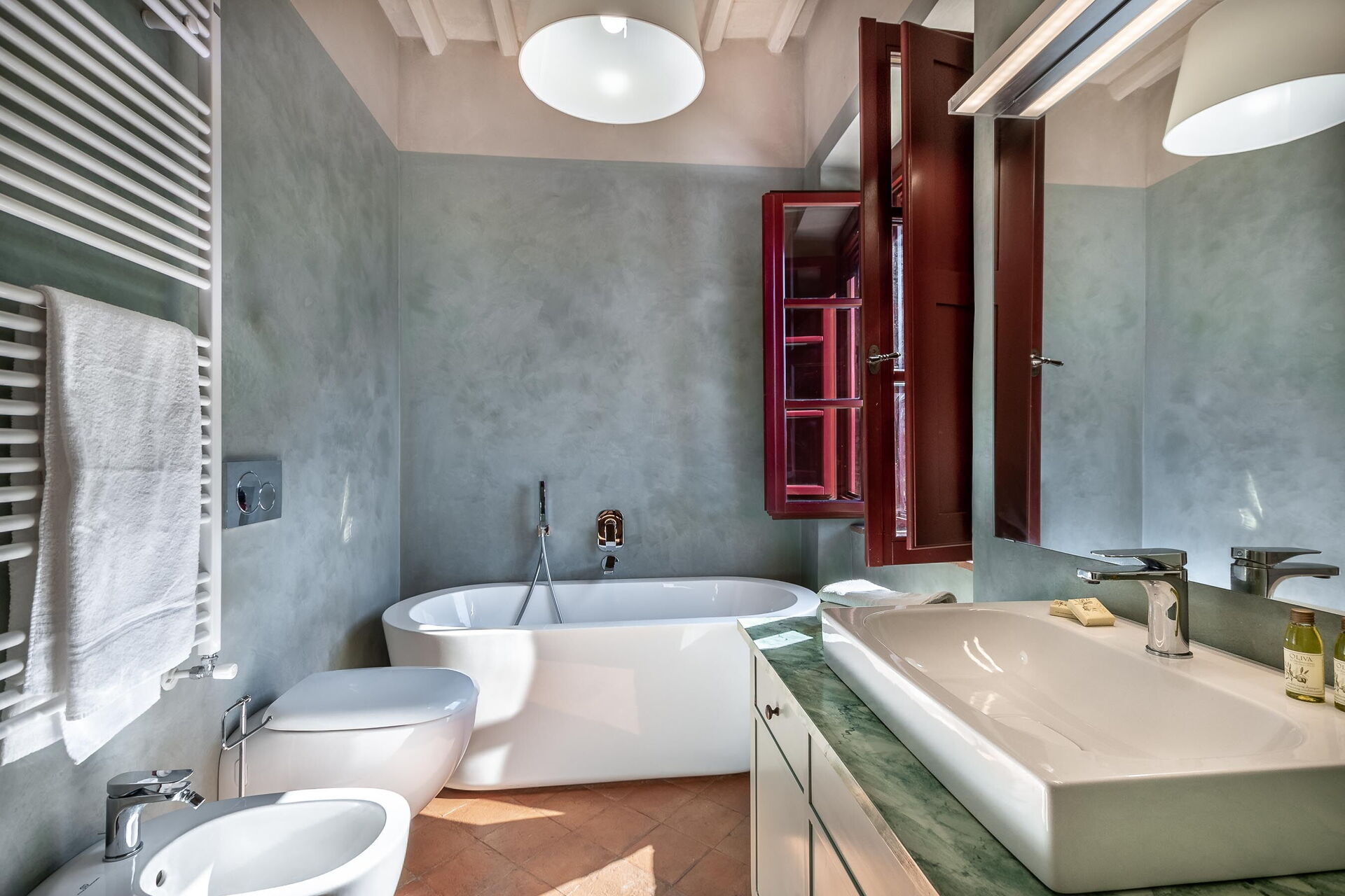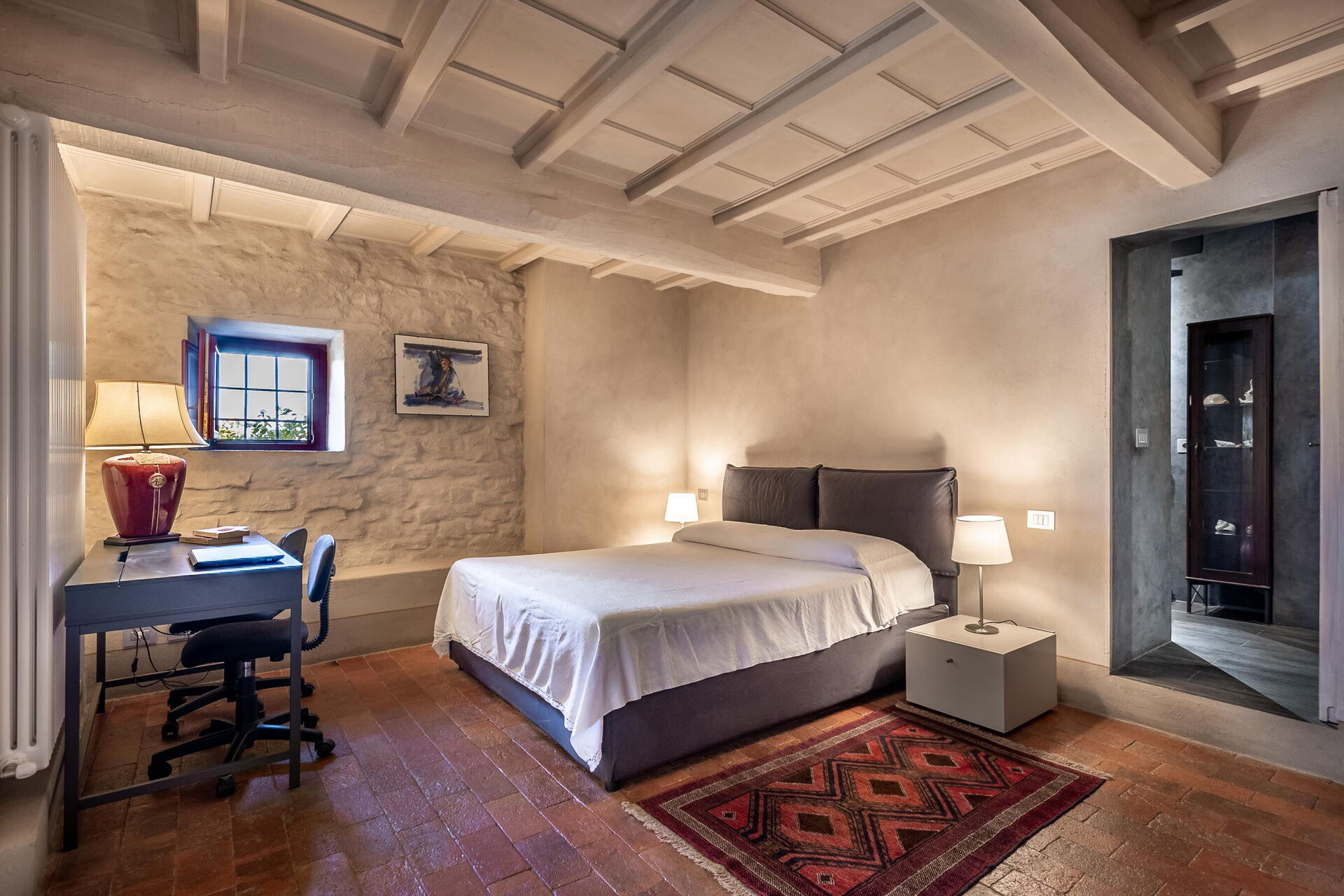 Slaapkamer met badkamer: tweepersoonsbed, WIFI internet, hor, satelliet tv, ventilator, bank, fauteuil, bureau, wastafel, toilet , bidet, douche, haardroger, uitgang naar de tuin, uitgang naar het terras.