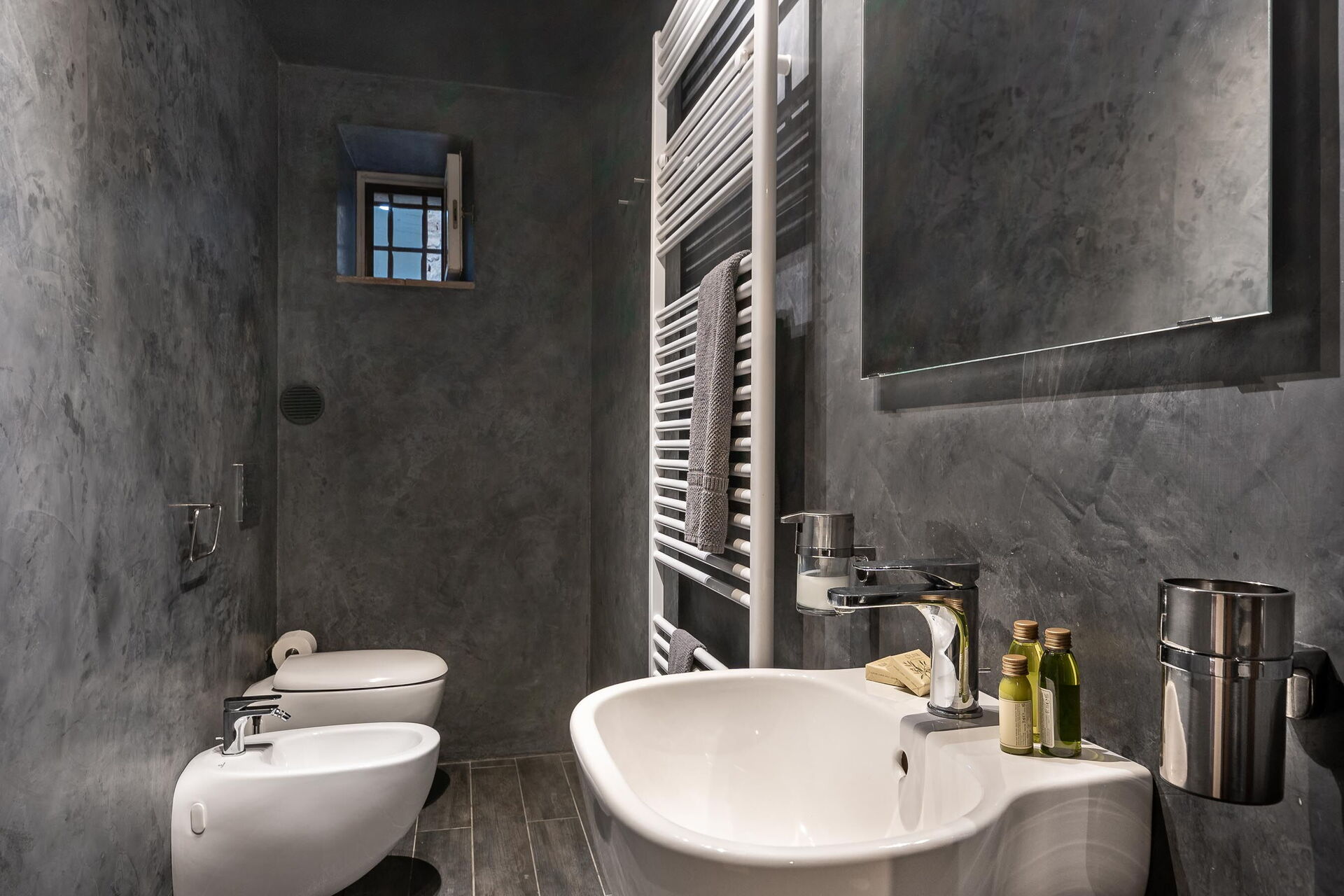 Badkamer: wastafel, toilet , bidet, douche, haardroger.