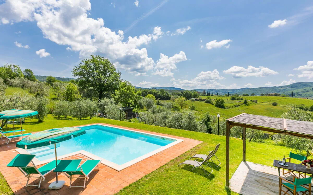 "L'Angolo di Uzzano" is een vakantiehuis voor twee gezinnen, gelegen in een rustig gehucht van vijf huizen op een heuvel in het hart van Greve in Chianti, Italië. Het pand ligt omgeven door bomen, velden en de karakteristieke wijngaarden van de Chianti-regio, met uitzicht op het Toscaanse landschap. Het vakantiehuis beschikt over twee hectare goed onderhouden terrastuinen met weelderige planten en volwassen bomen. De eigenaar en een tuinman onderhouden de tuinen en het zwembad.