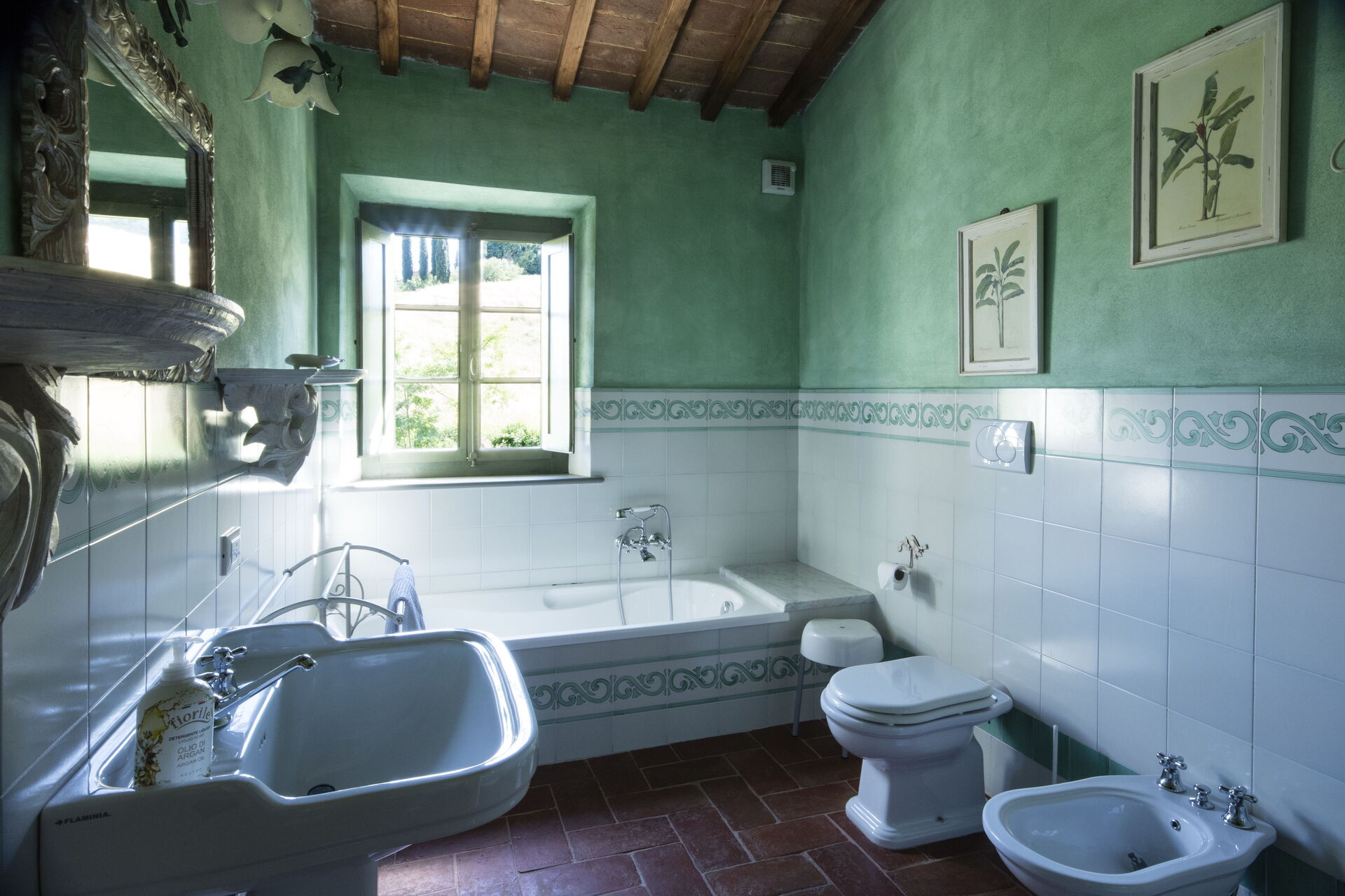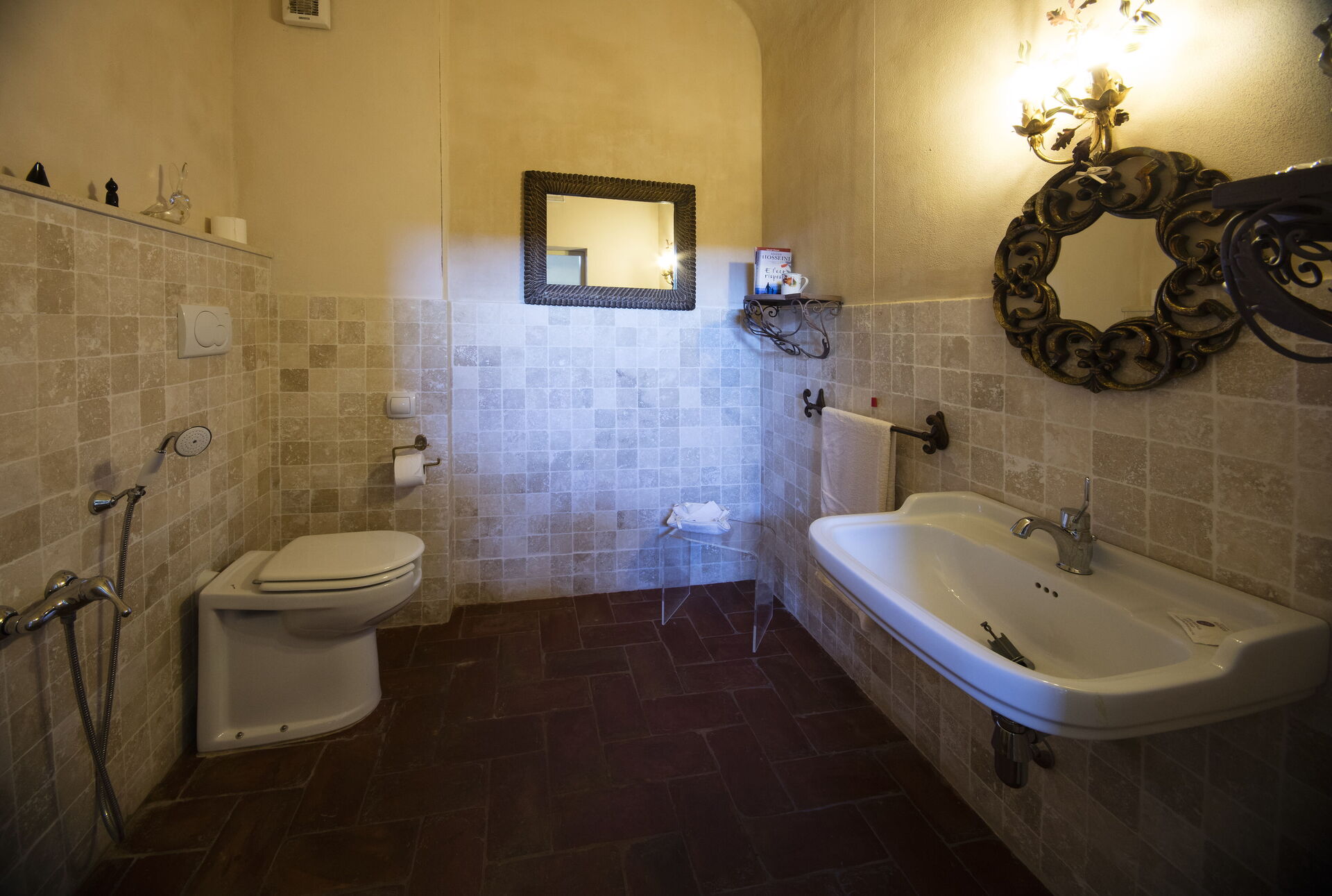 Badkamer: wastafel, toilet , bidet, bad, douche, haardroger.