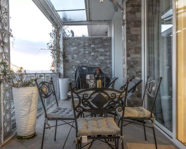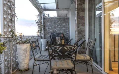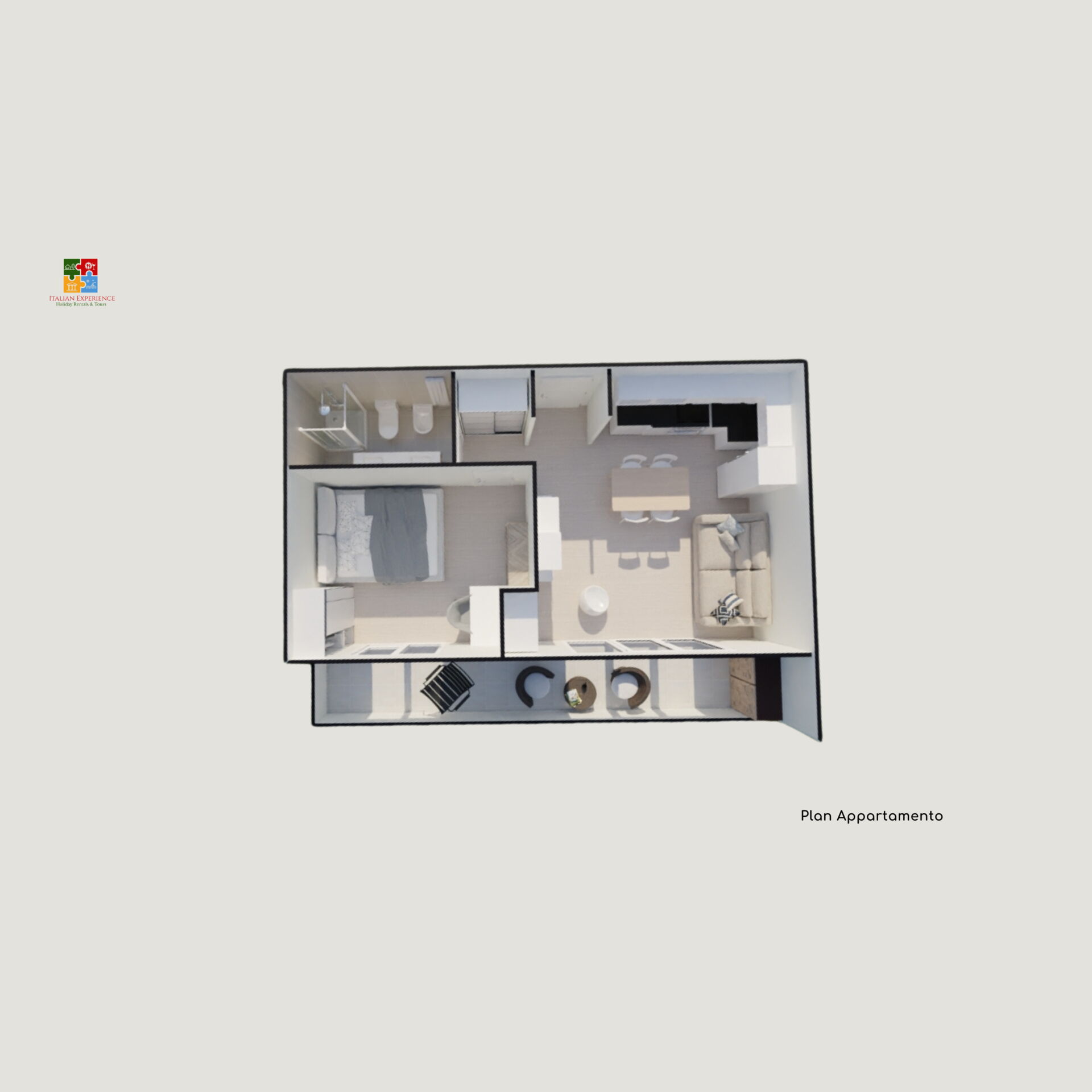 Keuken – woonkamer: goed uitgeruste keuken, eettafel, vaatwasser, ijskast, diepvriezer, magnetron, oven, broodrooster, italiaans koffiezetapparaat, koffiezetapparaat, bureau, tweepersoons-slaapbank, WIFI internet, internet, airconditioning, satelliet tv, uitgang naar het terras.