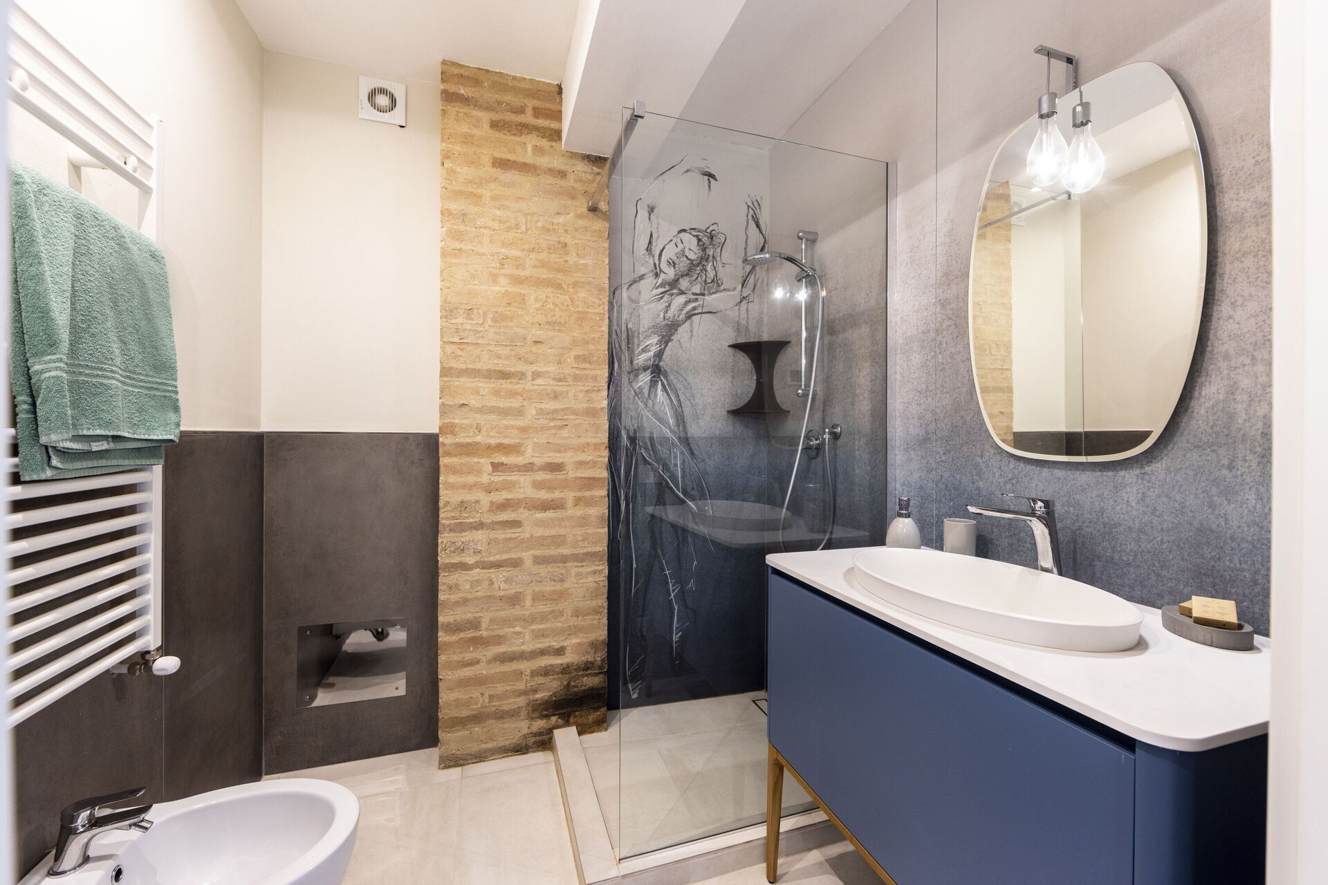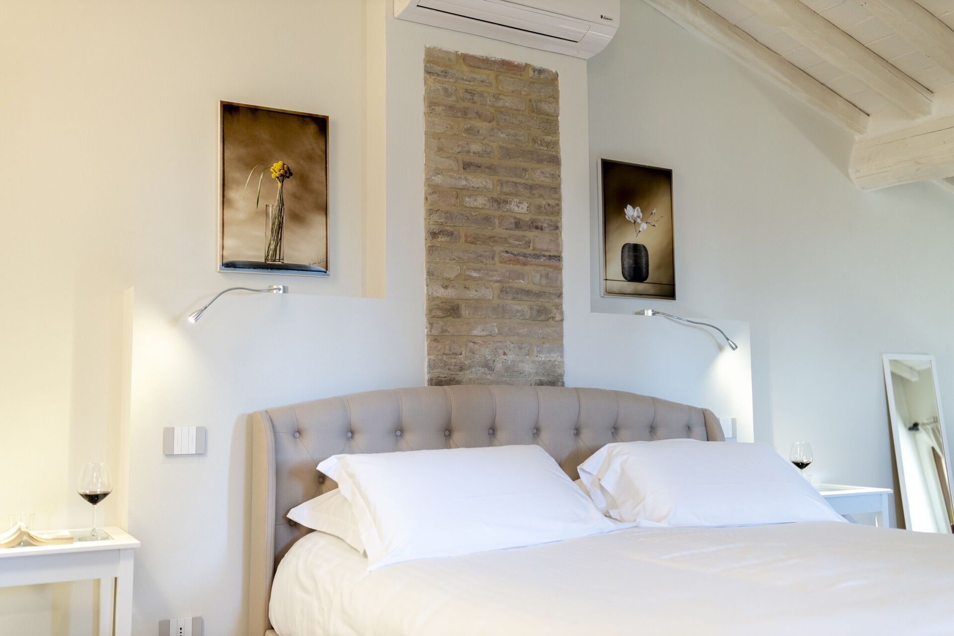 Slaapkamer met badkamer 1: tweepersoonsbed, airconditioning, hor, wastafel, toilet , bidet, douche, haardroger.