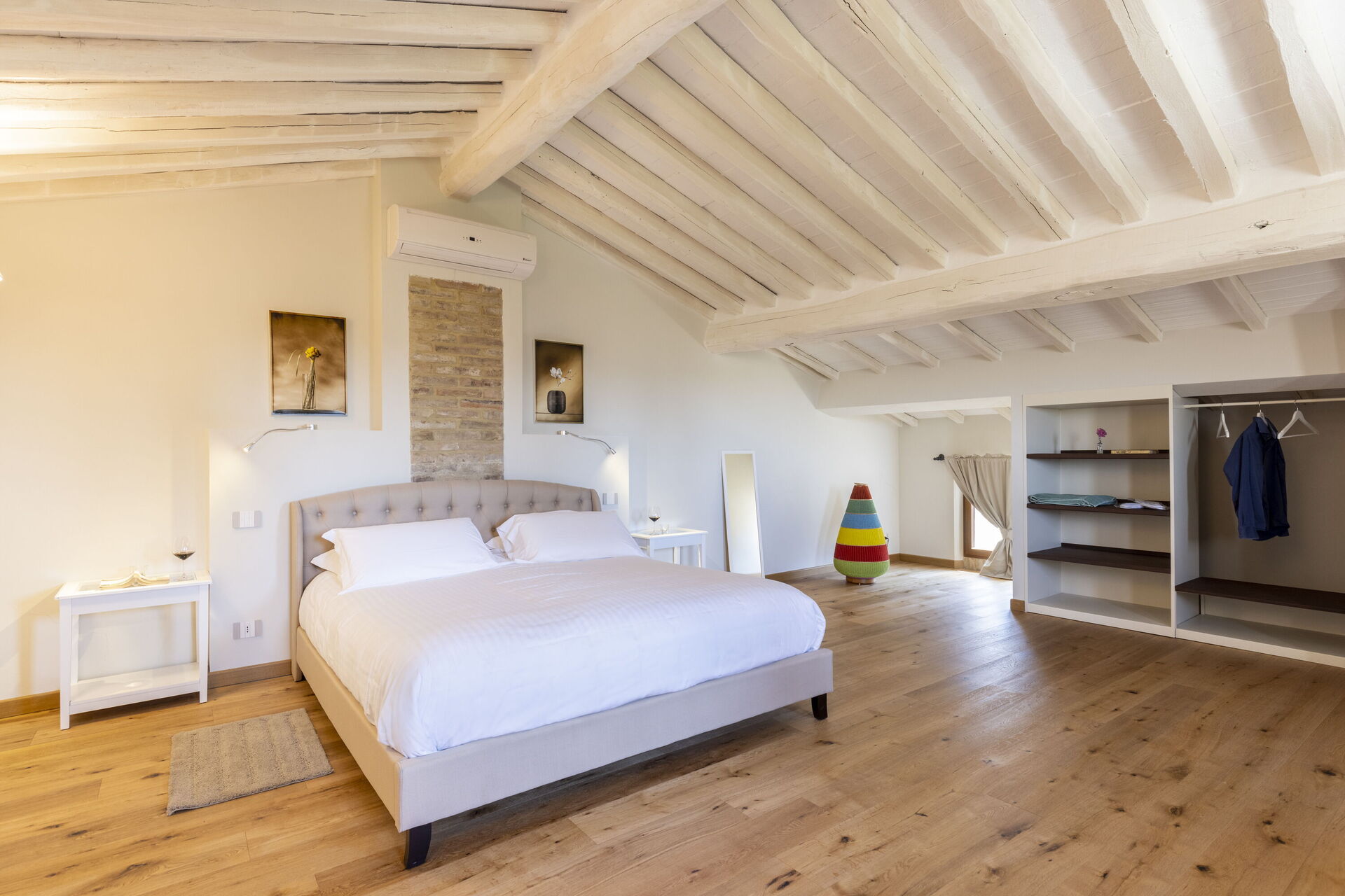 Slaapkamer met badkamer 5: tweepersoonsbed, airconditioning, hor, wastafel, toilet , bidet, douche, haardroger, uitgang naar het balkon.