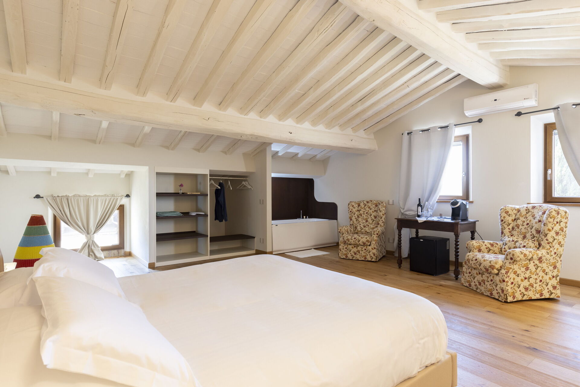 Slaapkamer met badkamer 3: tweepersoonsbed, airconditioning, hor, bubbelbad, wastafel, toilet , bidet, haardroger.