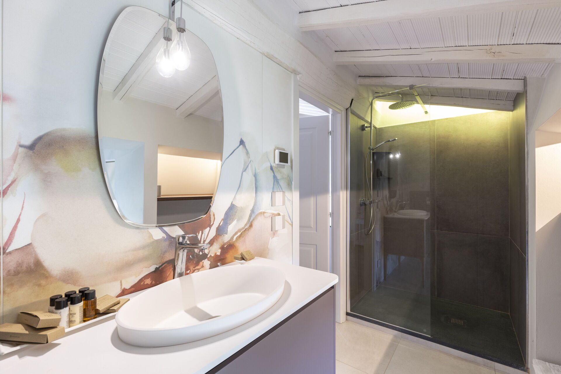 Slaapkamer met badkamer 2: tweepersoonsbed, airconditioning, hor, wastafel, toilet , bidet, douche, haardroger.