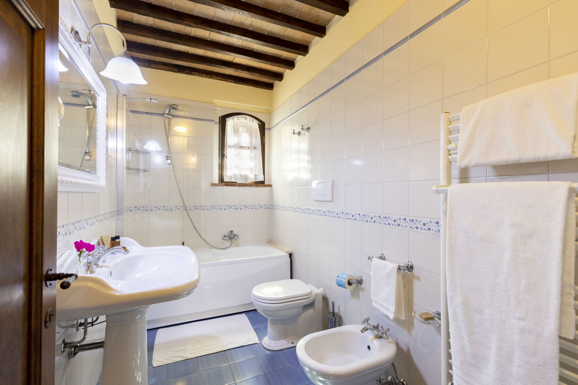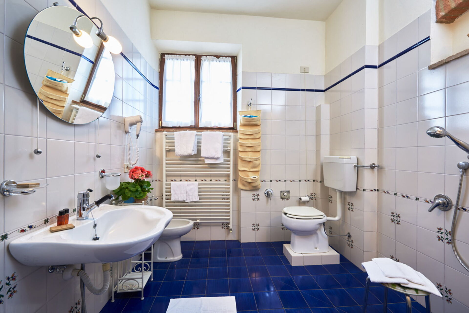 Slaapkamer met badkamer 6: tweepersoonsbed, eenpersoonsbed, airconditioning, hor, wastafel, toilet , bidet, douche, haardroger.