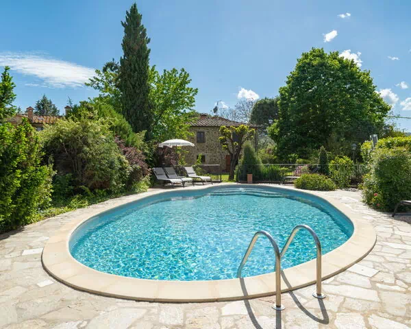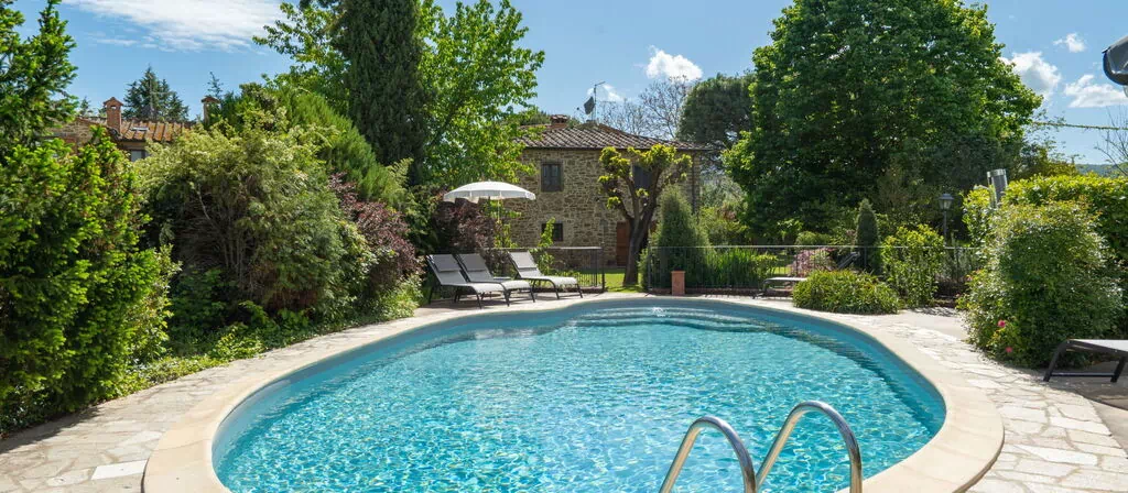 Het zwembad meet 11 x 5 meter met een diepte van 100 tot 175 cm en wordt onderhouden via een zout-elektrolyse reinigingssysteem; een buitendouche met warm water staat ter beschikking. Het zwembadgebied is voorzien van comfortabel tuinmeubilair en biedt uitzicht op de zonnebloemvelden die karakteristiek zijn voor het Toscaanse landschap. Bij zonsondergang is het kasteel Gargonza zichtbaar aan de horizon. Elk appartement beschikt over een eigen omheinde tuin van 400 m². De recreatiemogelijkheden omvatten een tafeltennistafel en een jeu de boulesbaan voor gasten van alle leeftijden.