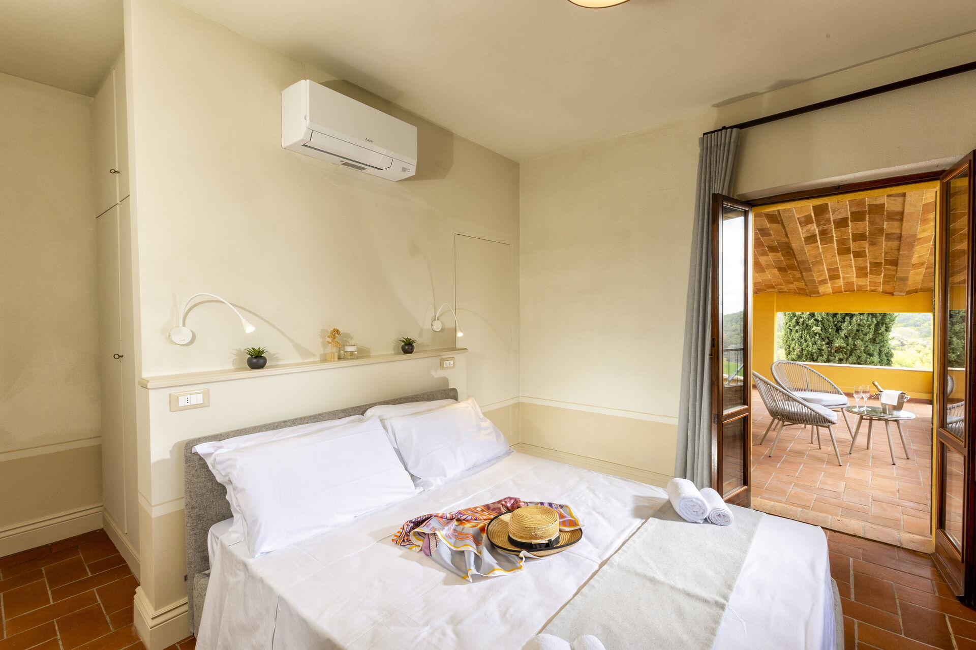 Slaapkamer met badkamer 2: tweepersoonsbed, airconditioning, hor, wastafel, toilet , bidet, douche, haardroger, uitgang naar de tuin.