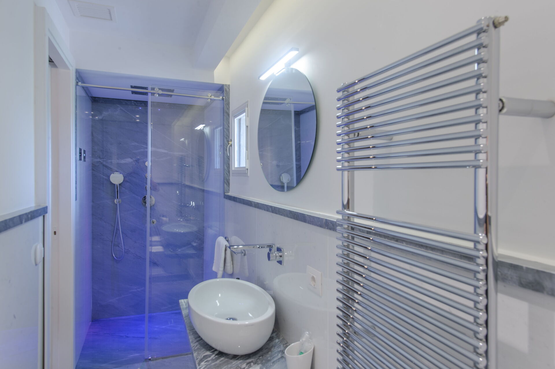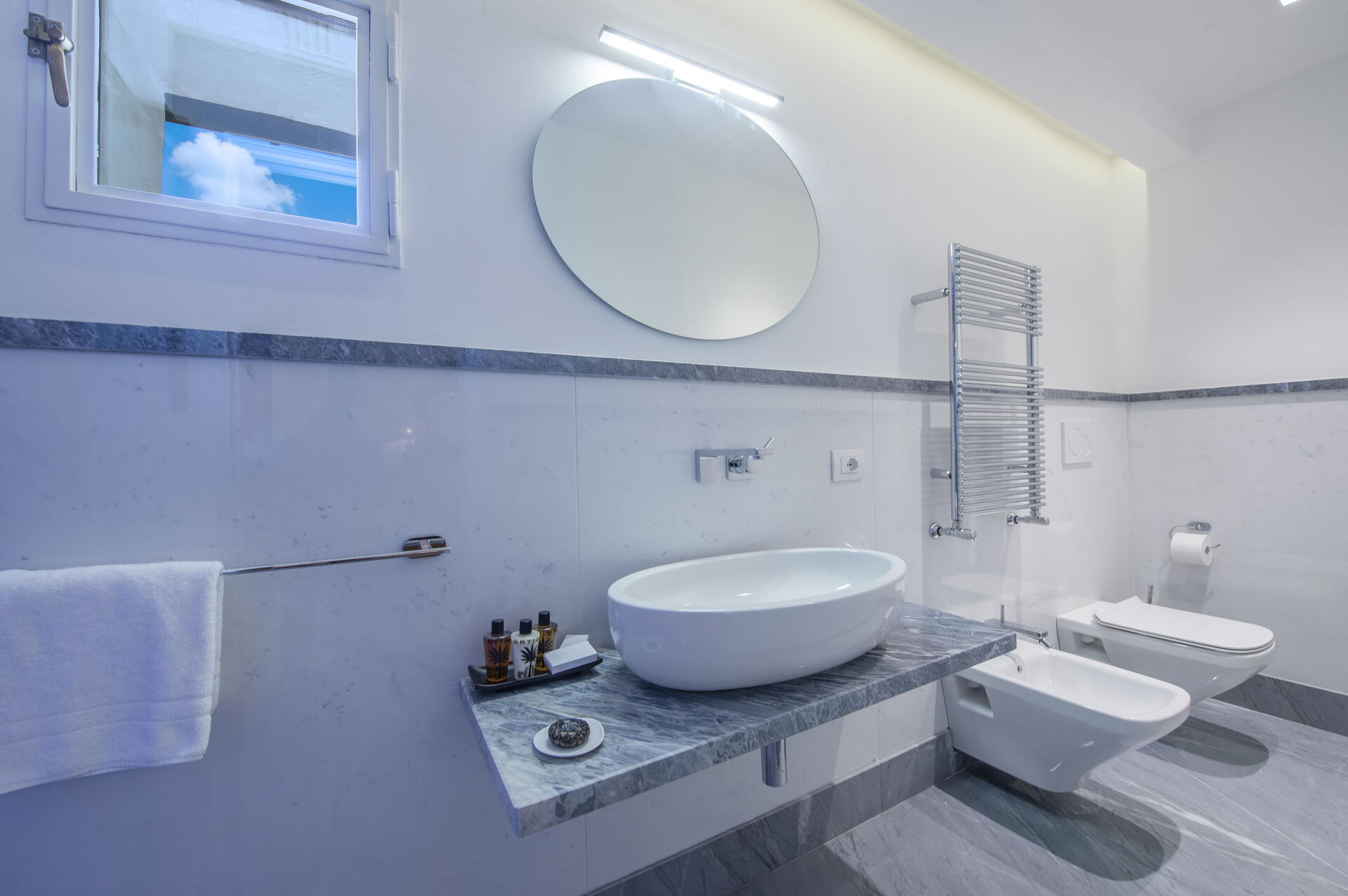 Slaapkamer met badkamer: tweepersoonsbed, WIFI internet, airconditioning, wastafel, toilet , bidet, douche, uitgang naar het balkon.
