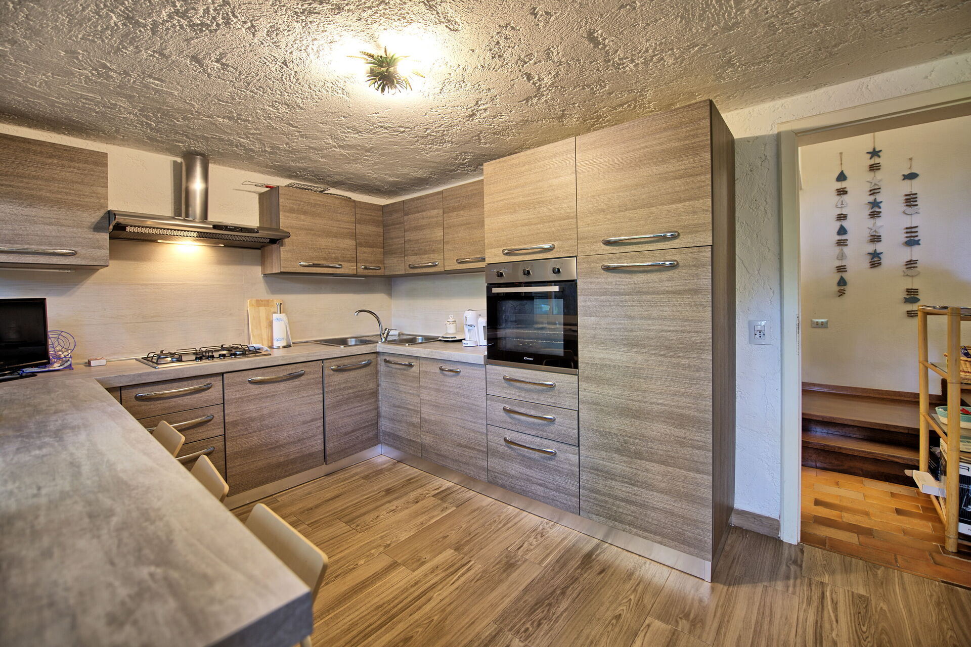 3 treden naar beneden: keuken (kookplaat, koelkast, oven, vaatwasser) met toegang tot de tuin (3 treden naar boven)