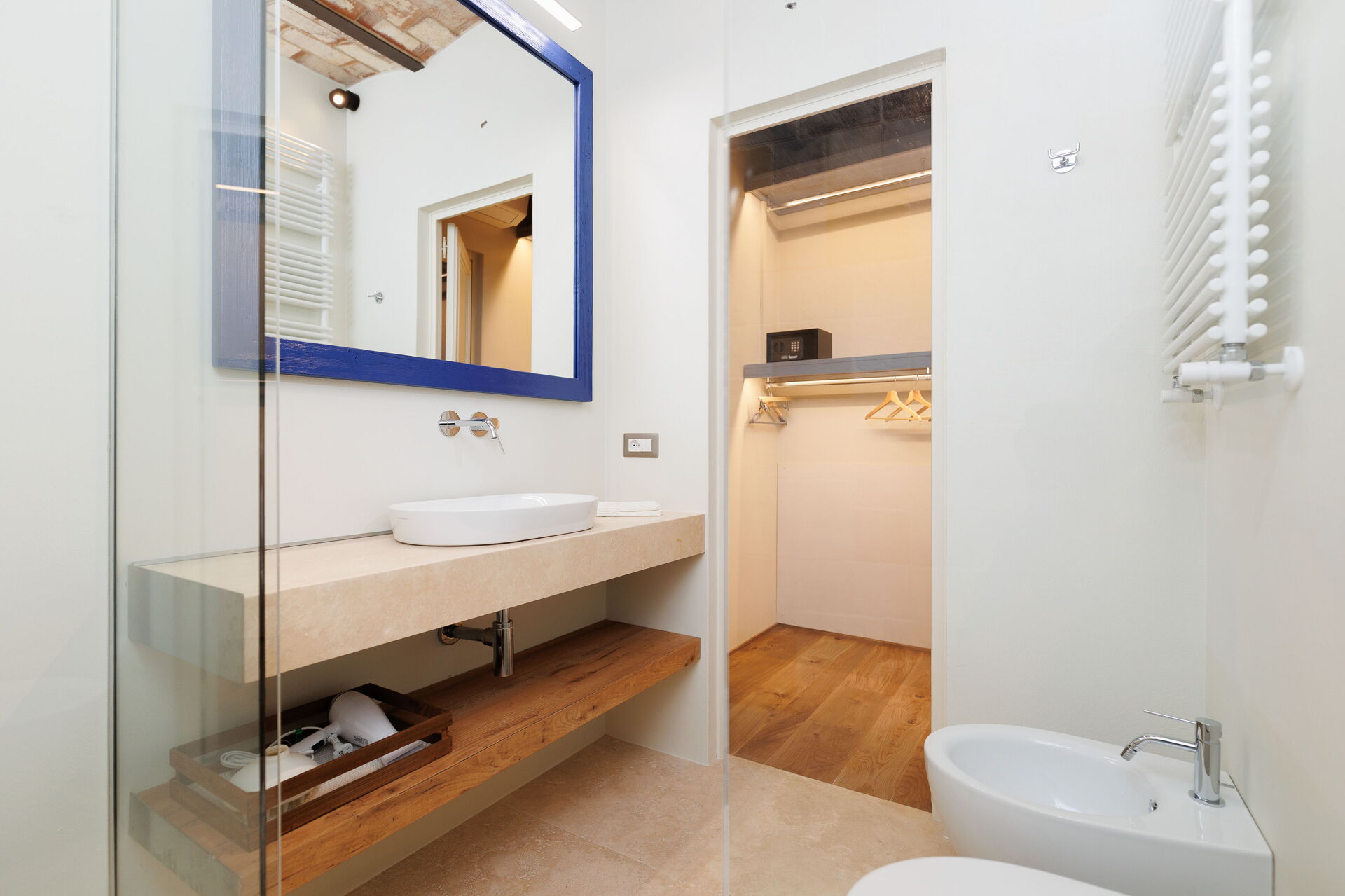 Slaapkamer met badkamer: king size bed, WIFI internet, airconditioning, hor, fauteuil, kluis, wastafel, toilet , bidet, douche, haardroger.