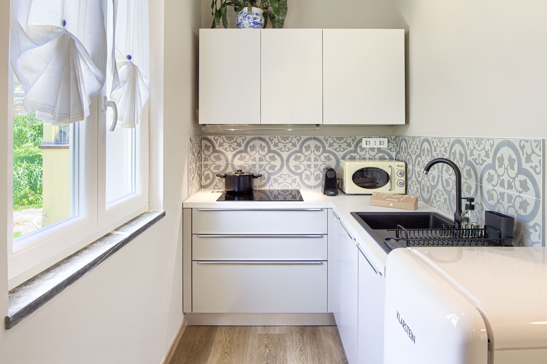 - Een woonkamer met kitchenette, uitgerust met inductiekookplaat, gecombineerde oven (magnetron + grill), spoelbak, koelkast met vriesvak, Nespresso-apparaat, Amerikaans koffiezetapparaat, Italiaanse Moka, waterkoker. Afwasmachine. Eettafel met 4 stoelen.