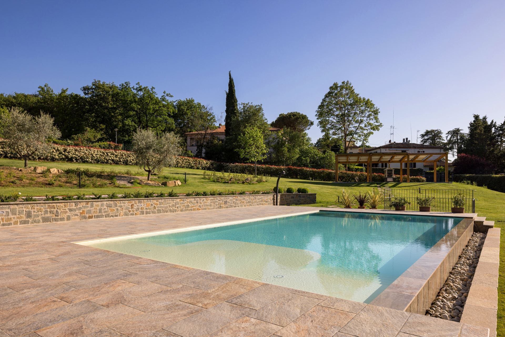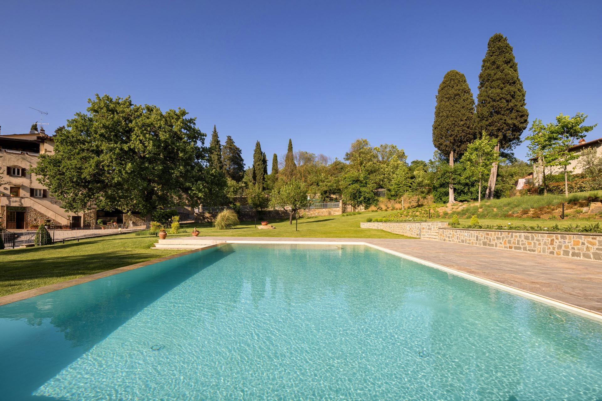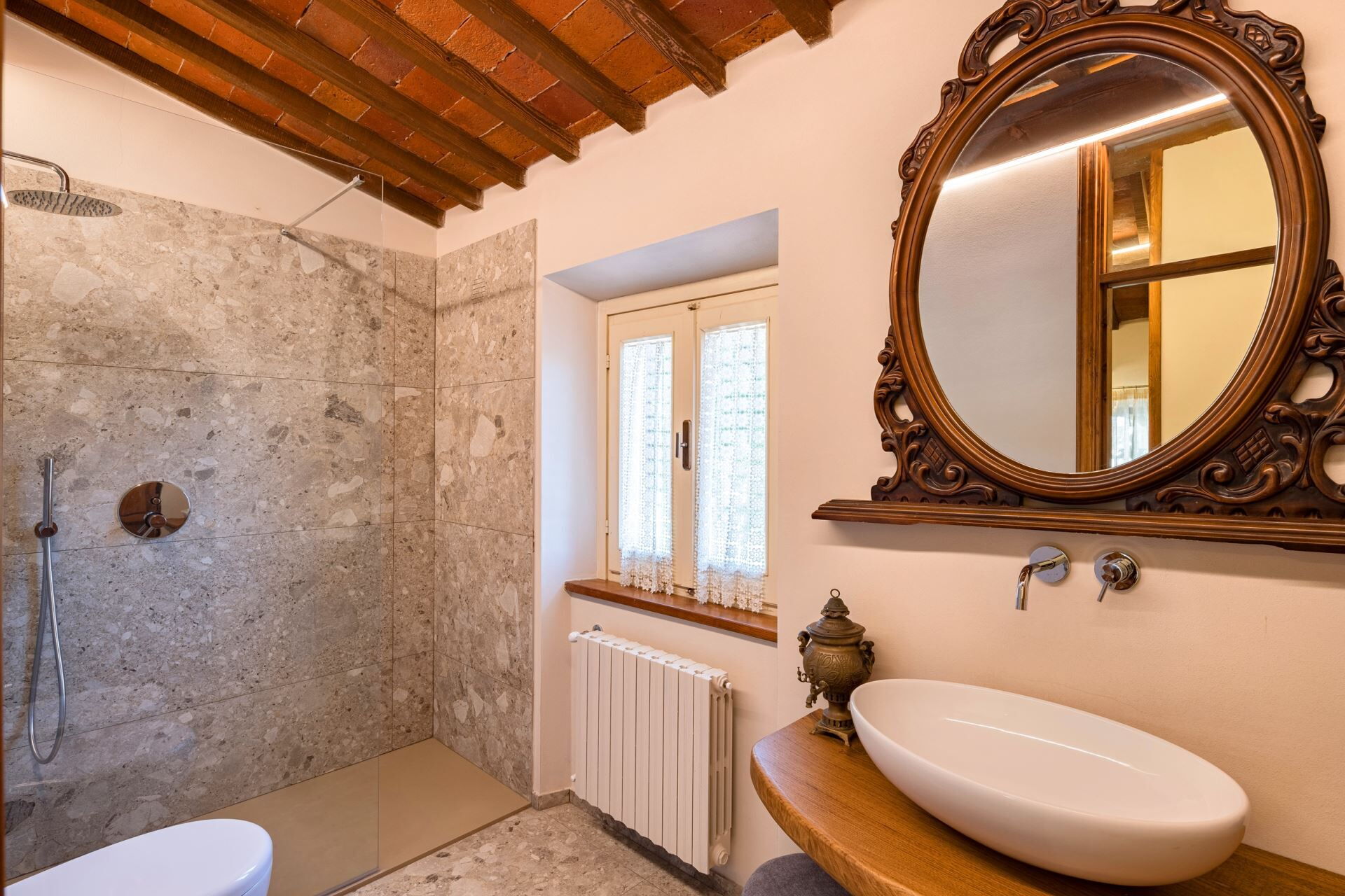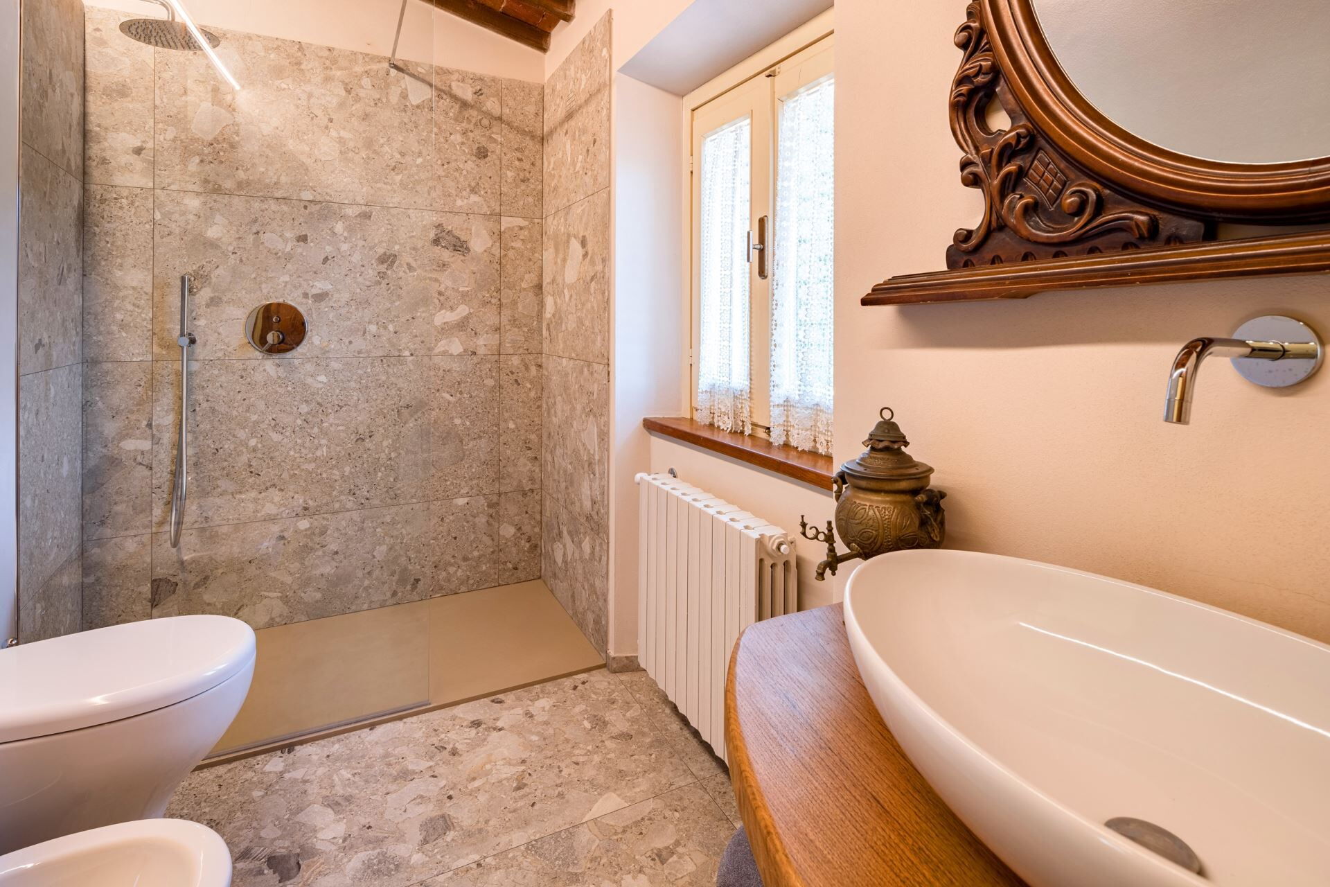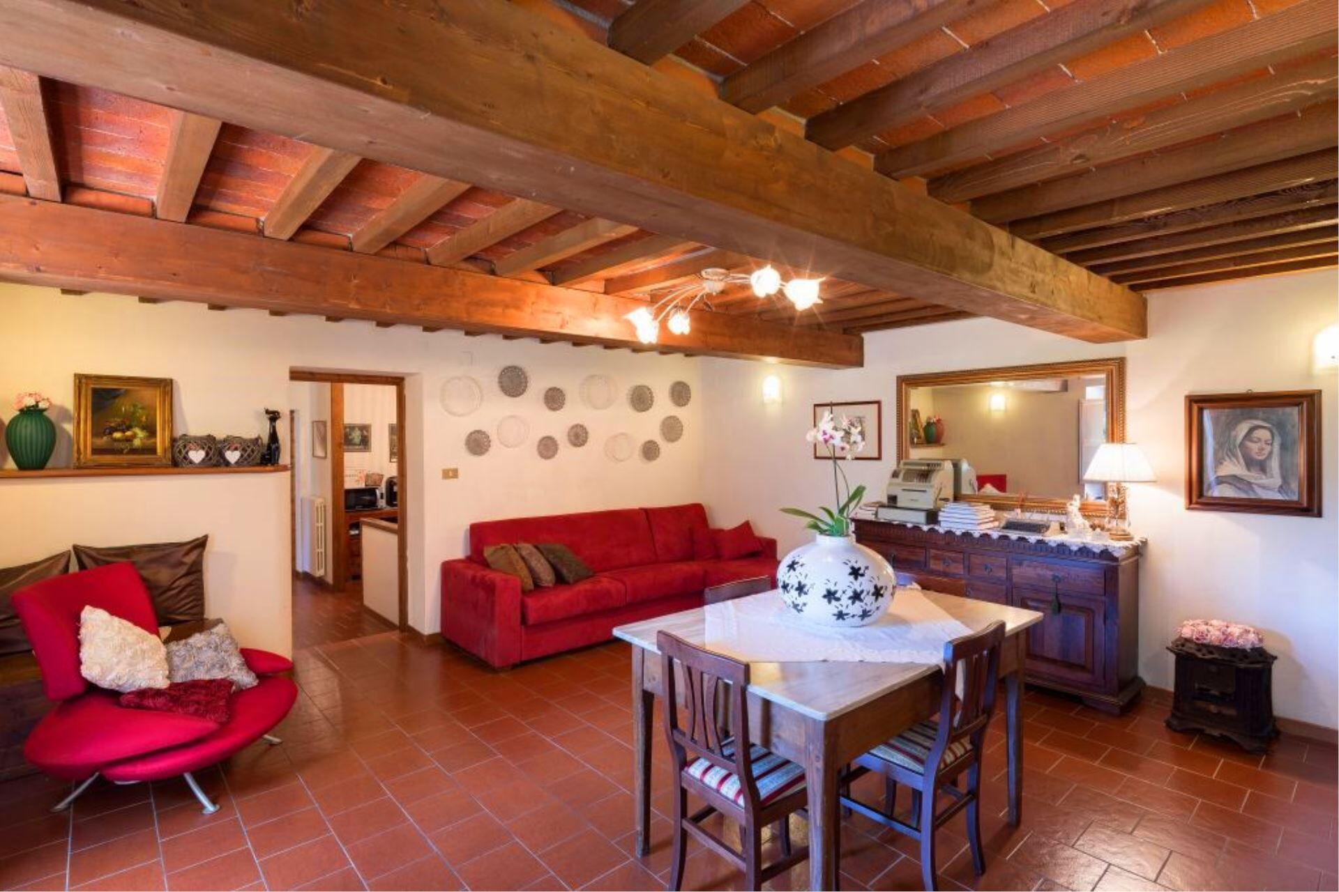 FIRST FLOOR with entrance from external staircase onto large living-dining room with double sofa bed, kitchen-dining room, double bedroom and bathroom with shower. From the living room, down some steps, there is a twin bedroom and private bathroom with shower.