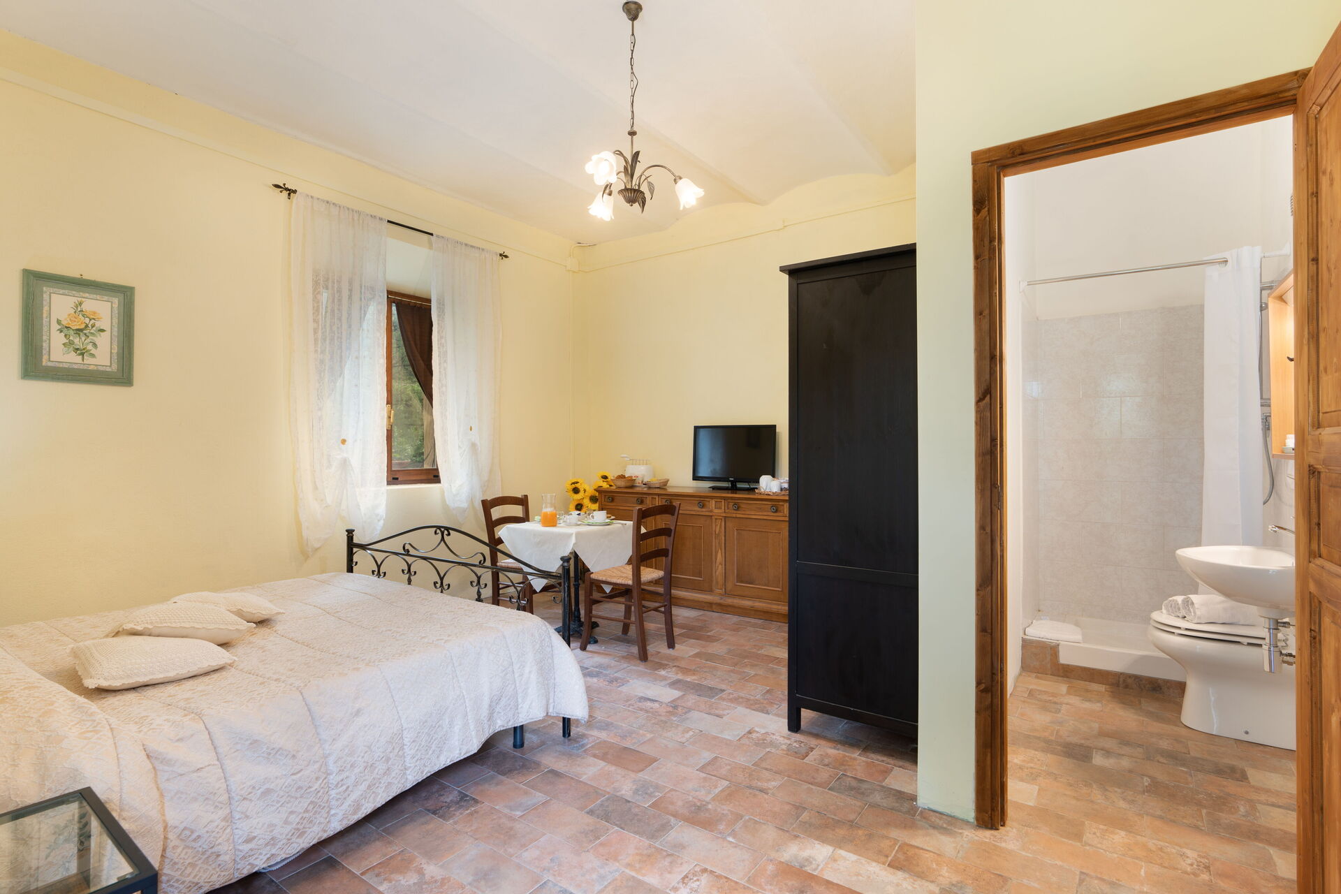 Slaapkamer met badkamer 2: tweepersoonsbed, WIFI internet, hor, satelliet tv, ijskast, wastafel, toilet , bidet, douche, haardroger.