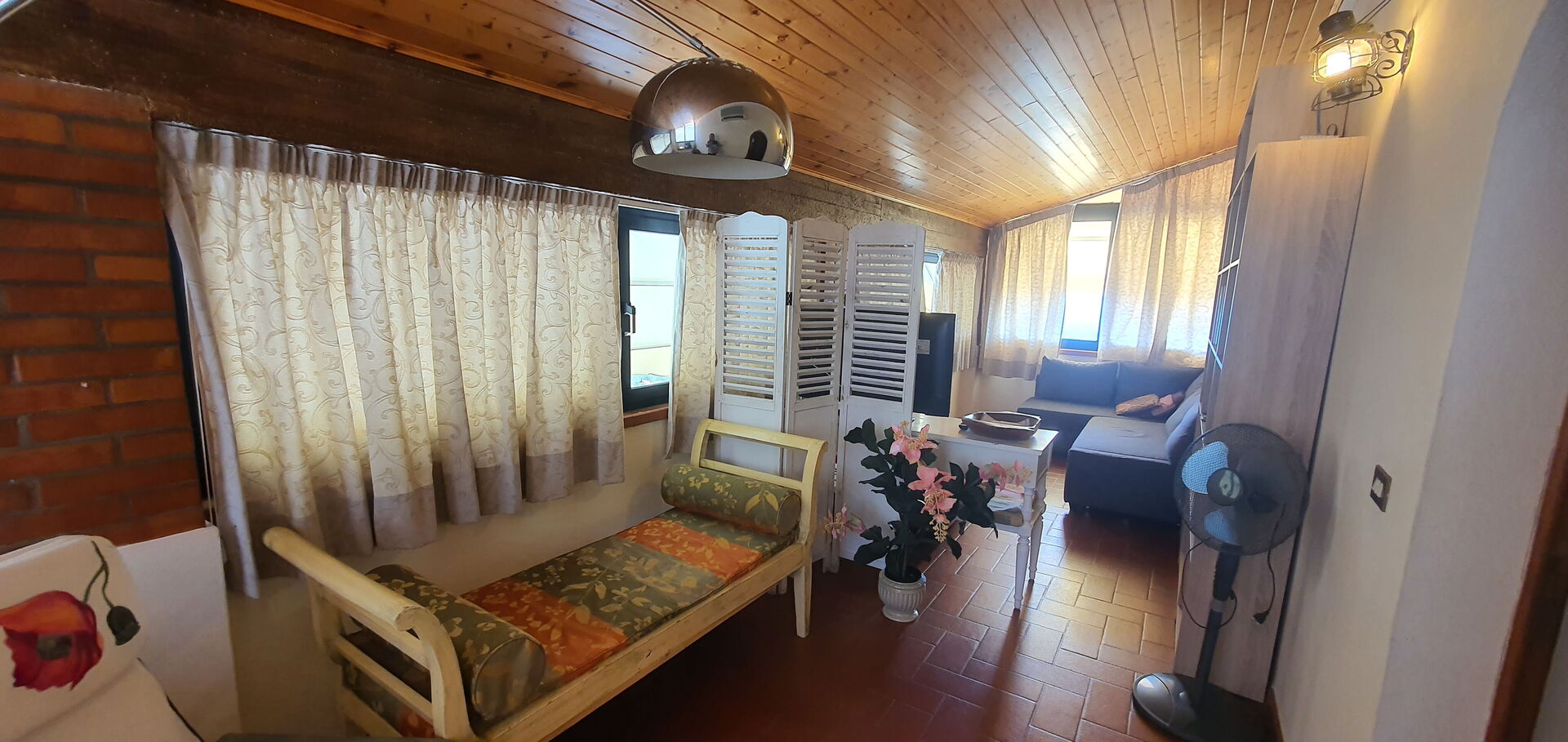 Woonkamer: bank (personen: 2), tweepersoons-slaapbank, tv, ventilator.