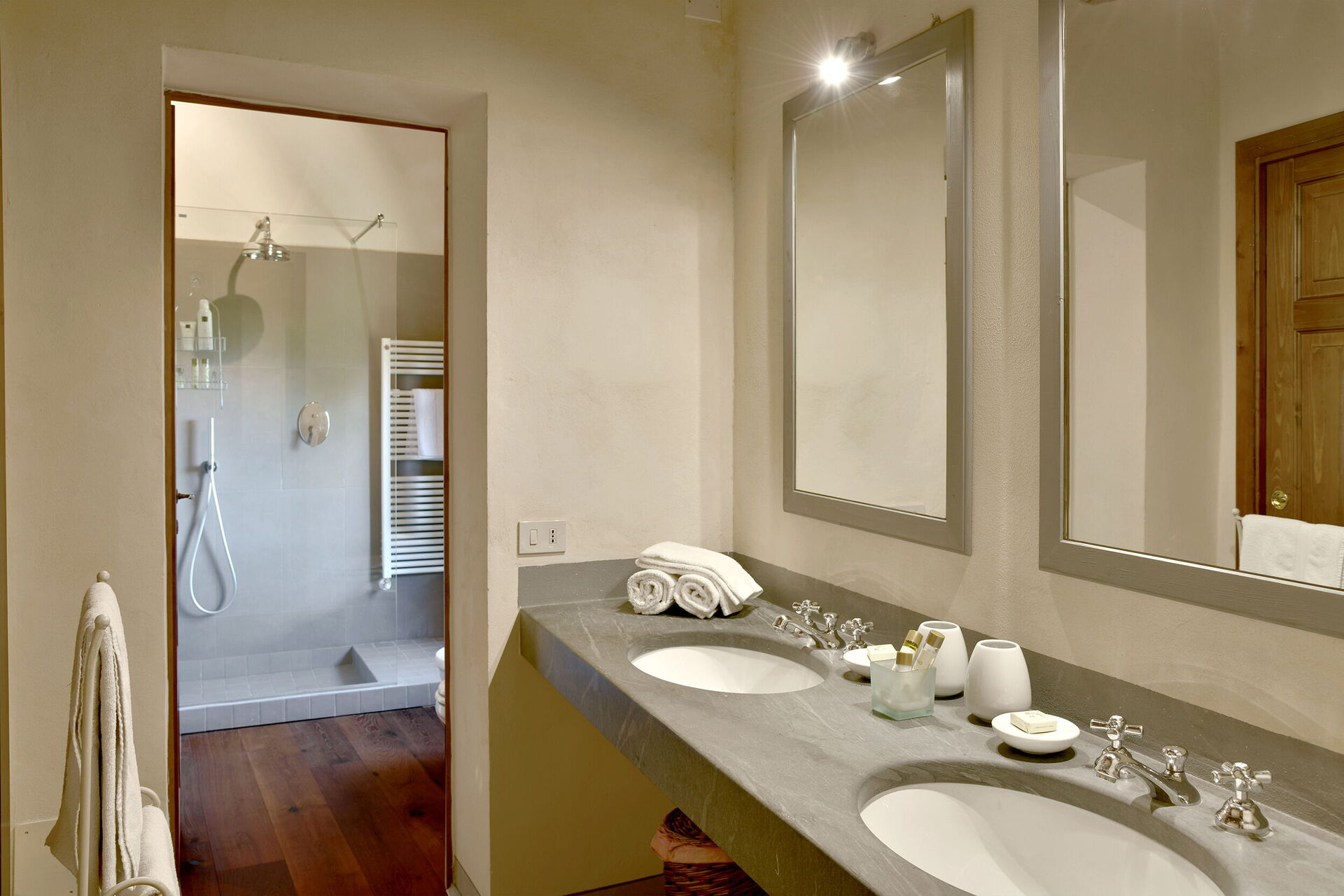 Slaapkamer met badkamer: tweepersoonsbed, WIFI internet, airconditioning, dubbele wastafel, toilet , douche, haardroger.