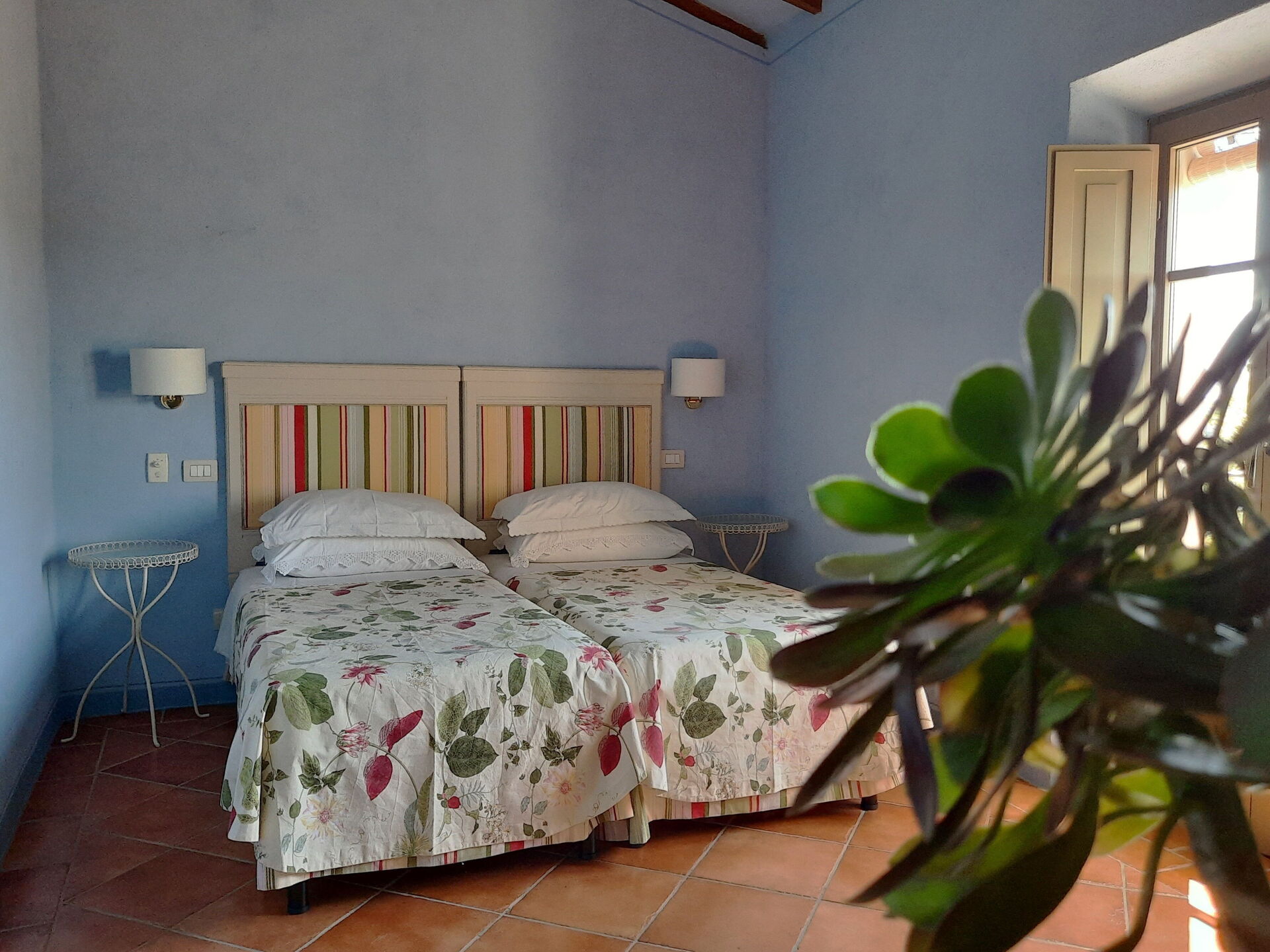 Slaapkamer met badkamer 3: twee eenpersoonsbedden (breedte: 0.8m, lengte: 1.9m), airconditioning, plafondventilator, twee fauteuils, wastafel, toilet , bidet, douche, haardroger.