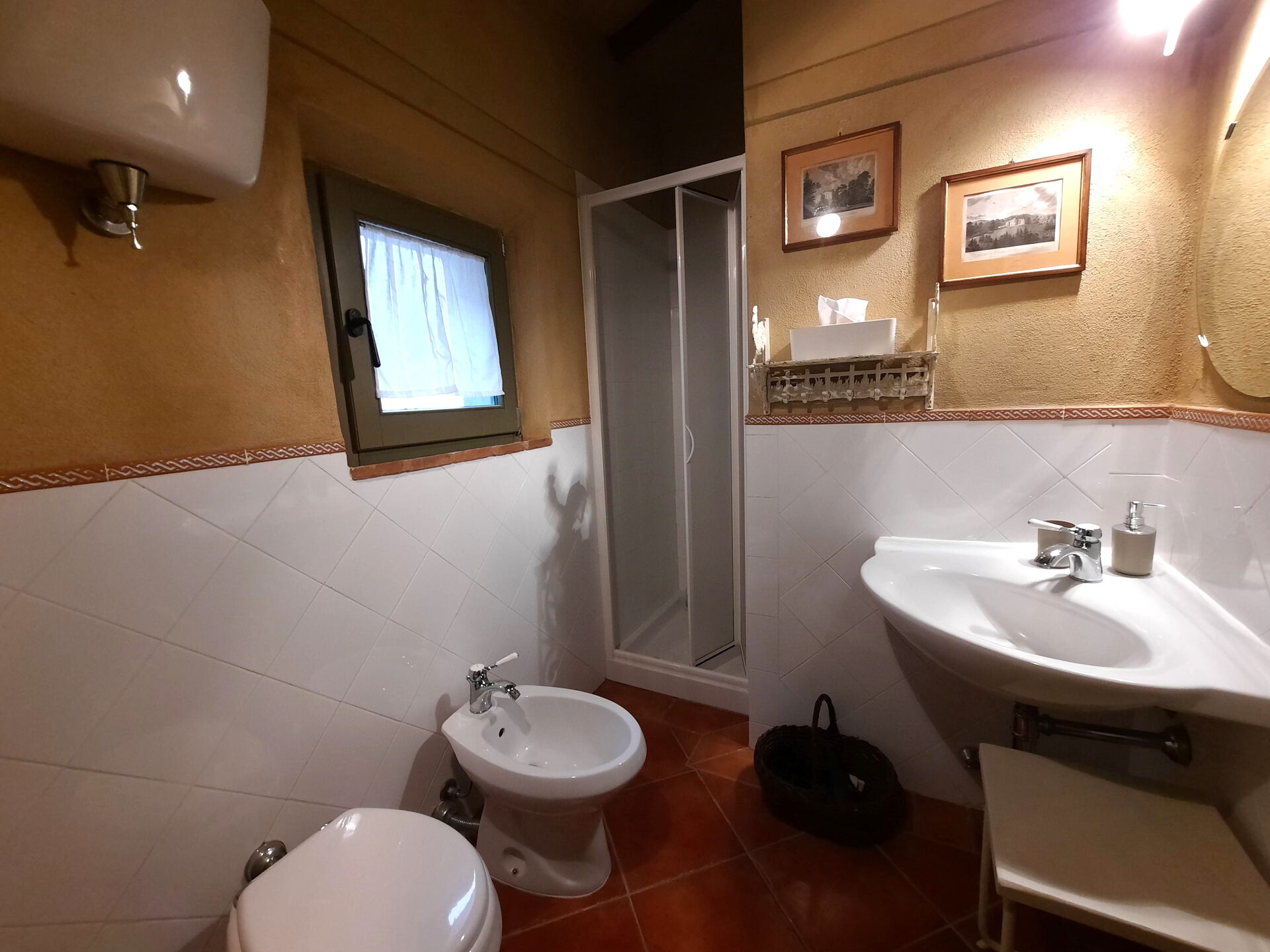 Badkamer 2: wastafel, toilet , bidet, douche, haardroger.