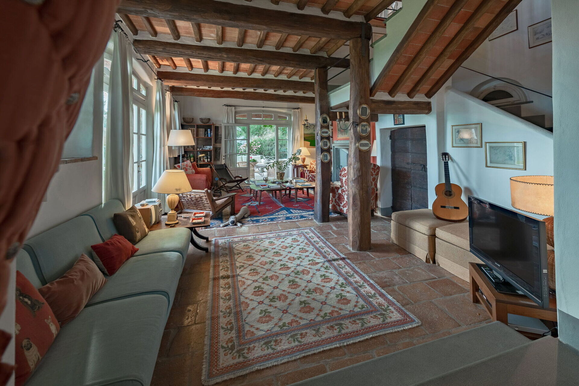 Ground floor: Two elegant living rooms welcome us: the first living room is furnished with sofa, card table and piano; the second one, larger, has a fireplace, tv, sofa, and direct access to the outdoor patio with lounge area and dining area.