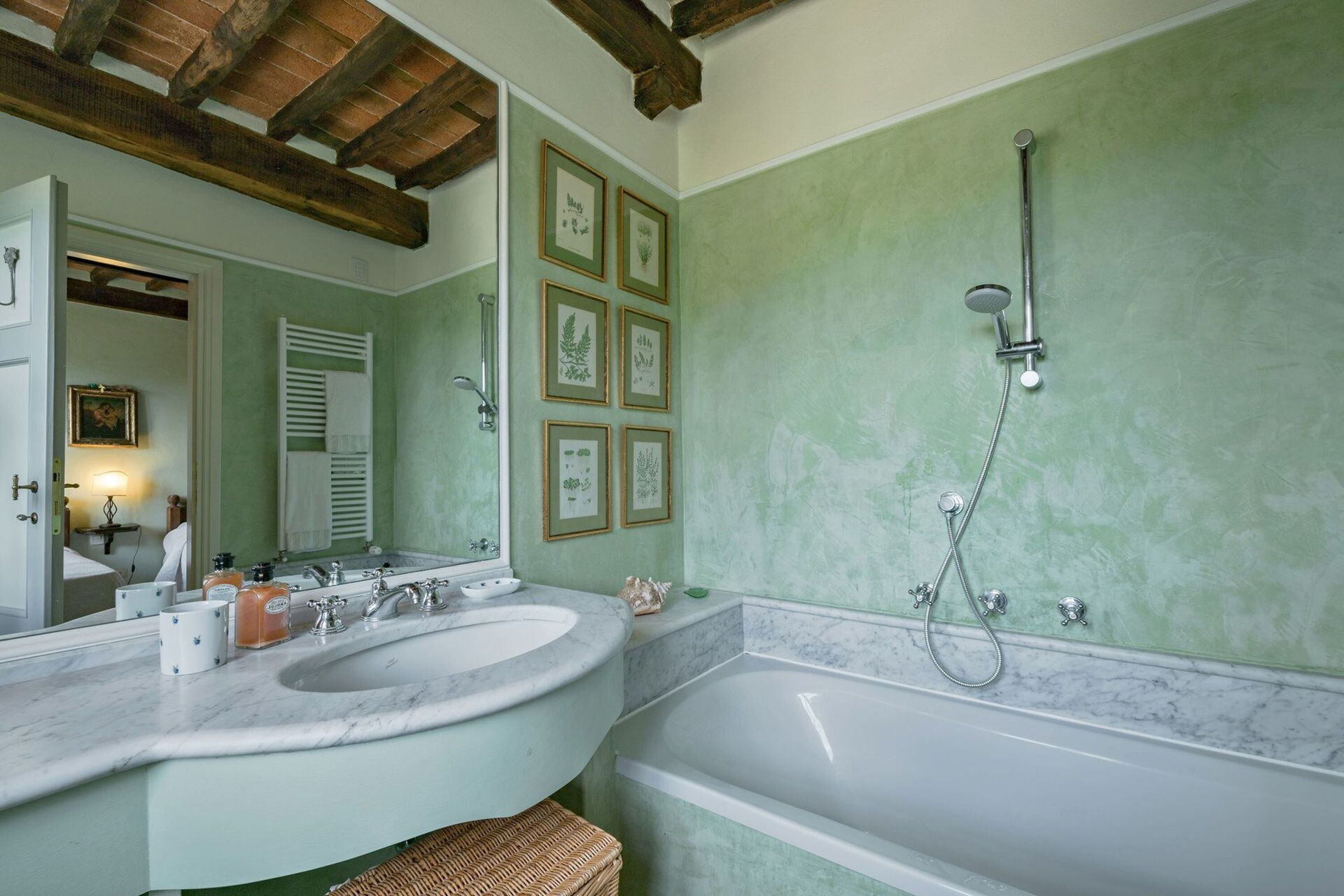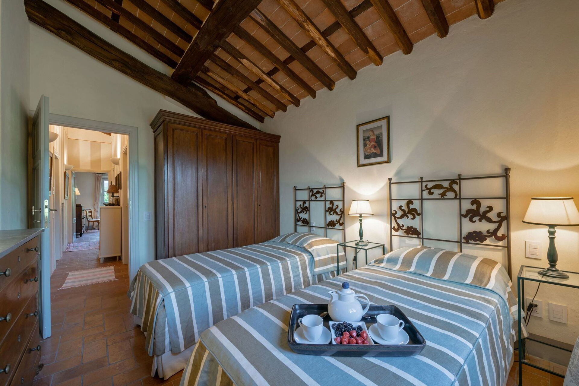 First floor: The upper floor houses the sleeping area with 5 bedrooms divided as follows: 1 double bedroom with ensuite bathroom (with bathtub); 1 twin with ensuite bathroom (with shower); 1 twin with ensuite bathroom (with bathtub); 1 double with private terrace and 1 twin sharing access to a bathroom with shower.