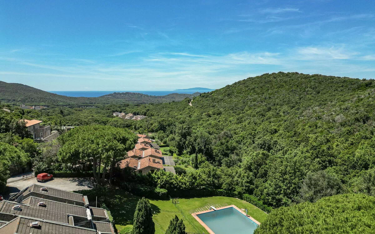 "Le Mandrie", huis in een rij 4-kamers 70 m2 op 2 verdiepingen. Het objekt is geschikt voor 4 volwassenen + 2 kinderen. Doelmatig en gezellig ingericht: woon-/eetkamer met eettafel. Uitgang naar het terras. Open keuken (oven, afwasmachine, 4 kookpitten (vlammen), waterkoker, magnetron, elektrische koffiemachine). Uitgang naar het terras. Douche/bidet/WC. Bovenverdieping: (wenteltrap) kleine woonkamer met TV. 1 2-pers. kamer met panoramavenster, zonder kast. Doorgangskamer met 1 bed en 1 uitschuifbaar bed. 1 2-pers. kamer met panoramavenster. Douche/bidet/WC. Gas-verwarming. Verwarming alleen beschikbaar van 01.11. tot 15.04. Terras. Terrasmeubelen. Mooi uitzicht op het zwembad, het bos en de oceaan. Ter beschikking: wasmachine, klamboe, kinderbed tot 2 jaar (extra), haardroger. Internet (WiFi, gratis). Parkeerplaats. Maximaal 1 huisdier/hond toegestaan. Privé ingang. Er hoeven geen verplichte extra kosten ter plaatse te worden betaald, behalve de lokale belasting. Bedlinnen, handdoeken, eindschoonmaak en alle energiekosten zijn inclusief. IT053006C2TYDFYYES