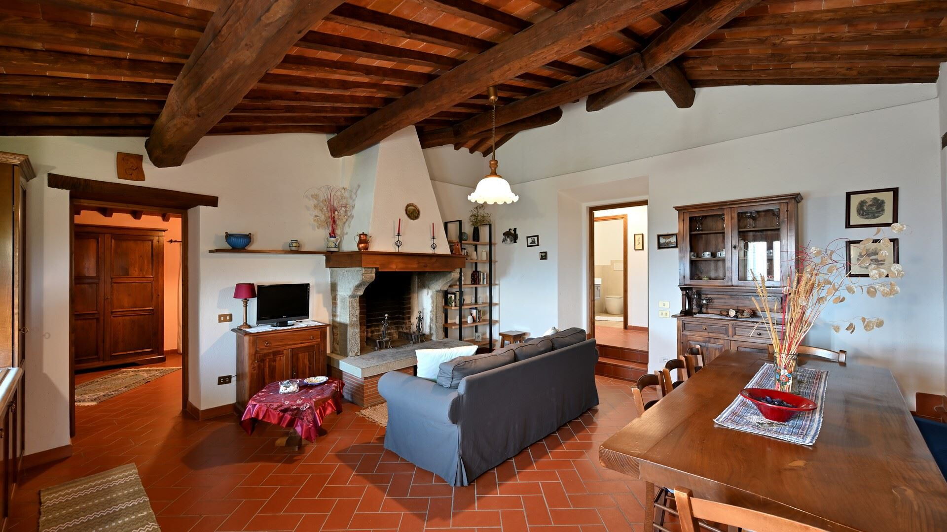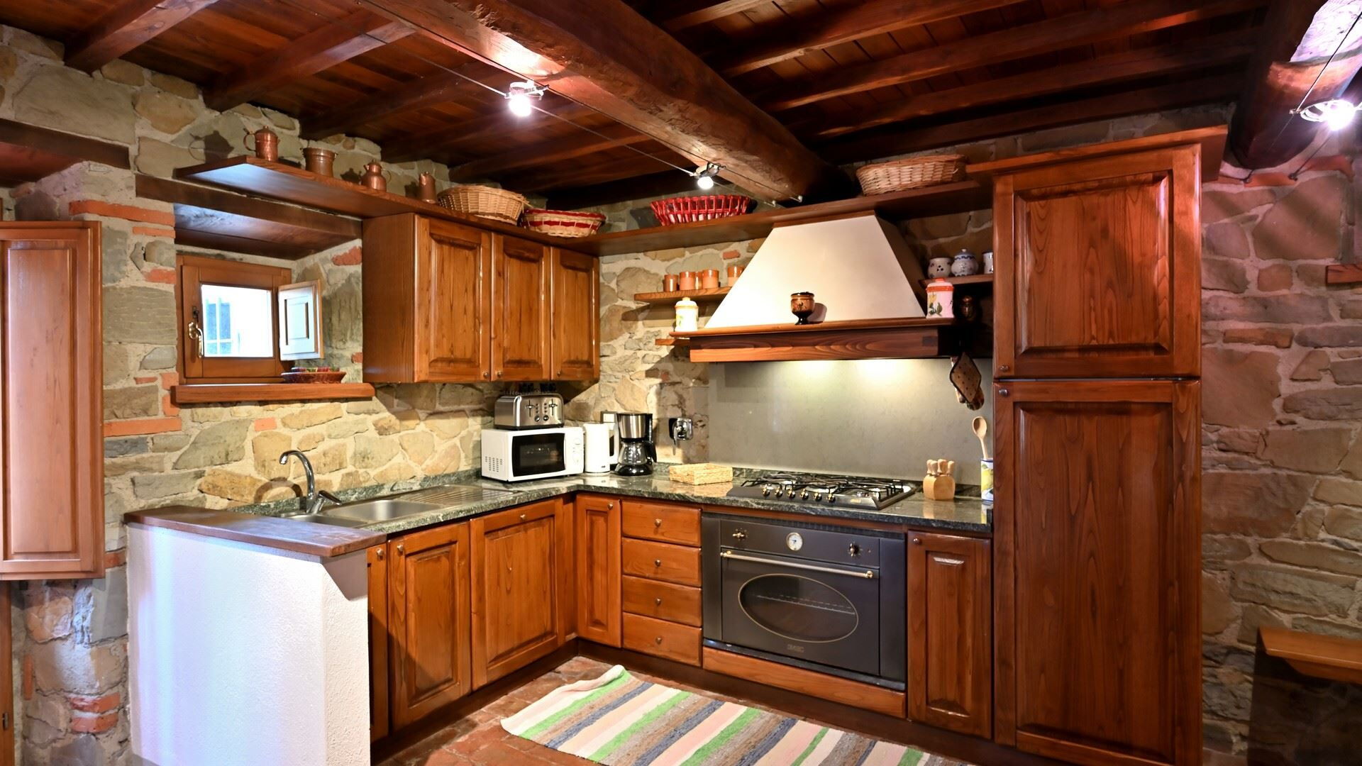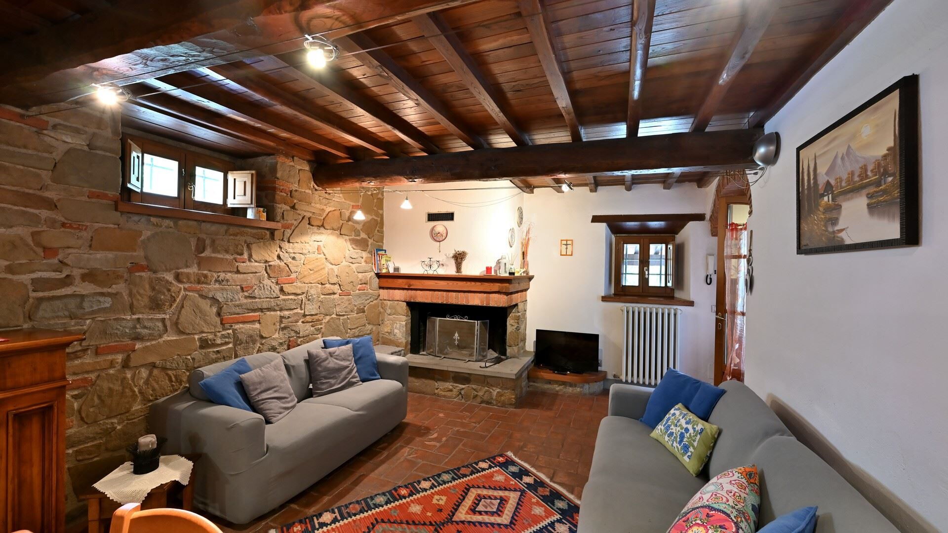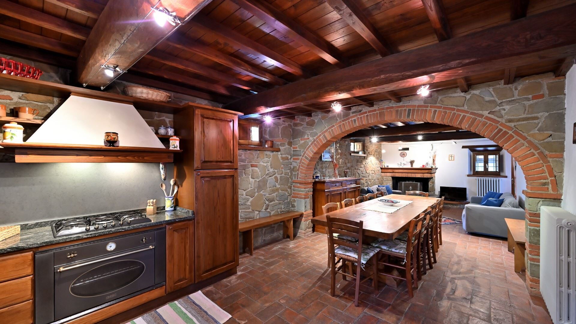 Keuken – woonkamer: goed uitgeruste keuken, eettafel, vaatwasser, ijskast, diepvriezer, magnetron, kookplaat, oven, broodrooster, italiaans koffiezetapparaat, koffiezetapparaat, twee banken (personen: 6), open haard, WIFI internet, twee kinderstoelen, tv, rookmelder, co2 detector, uitgang naar de tuin.