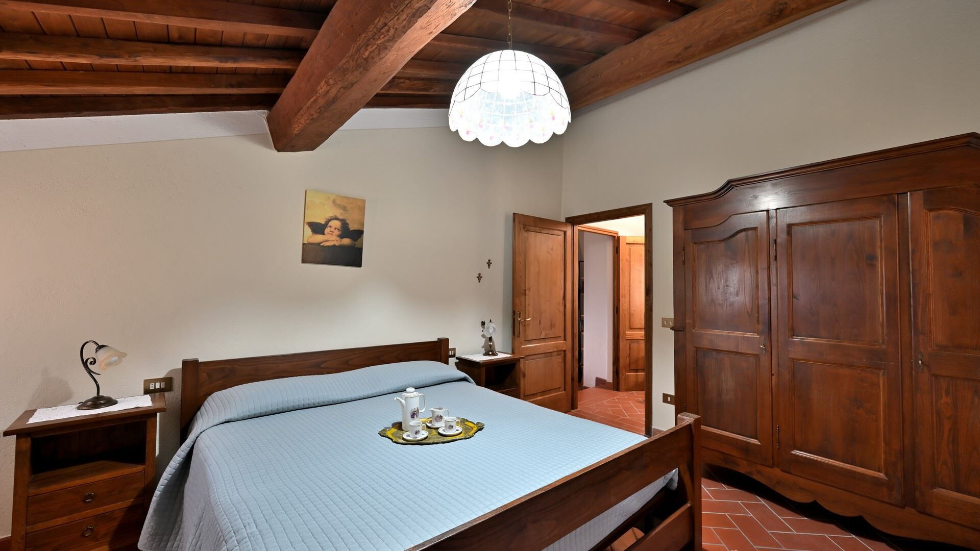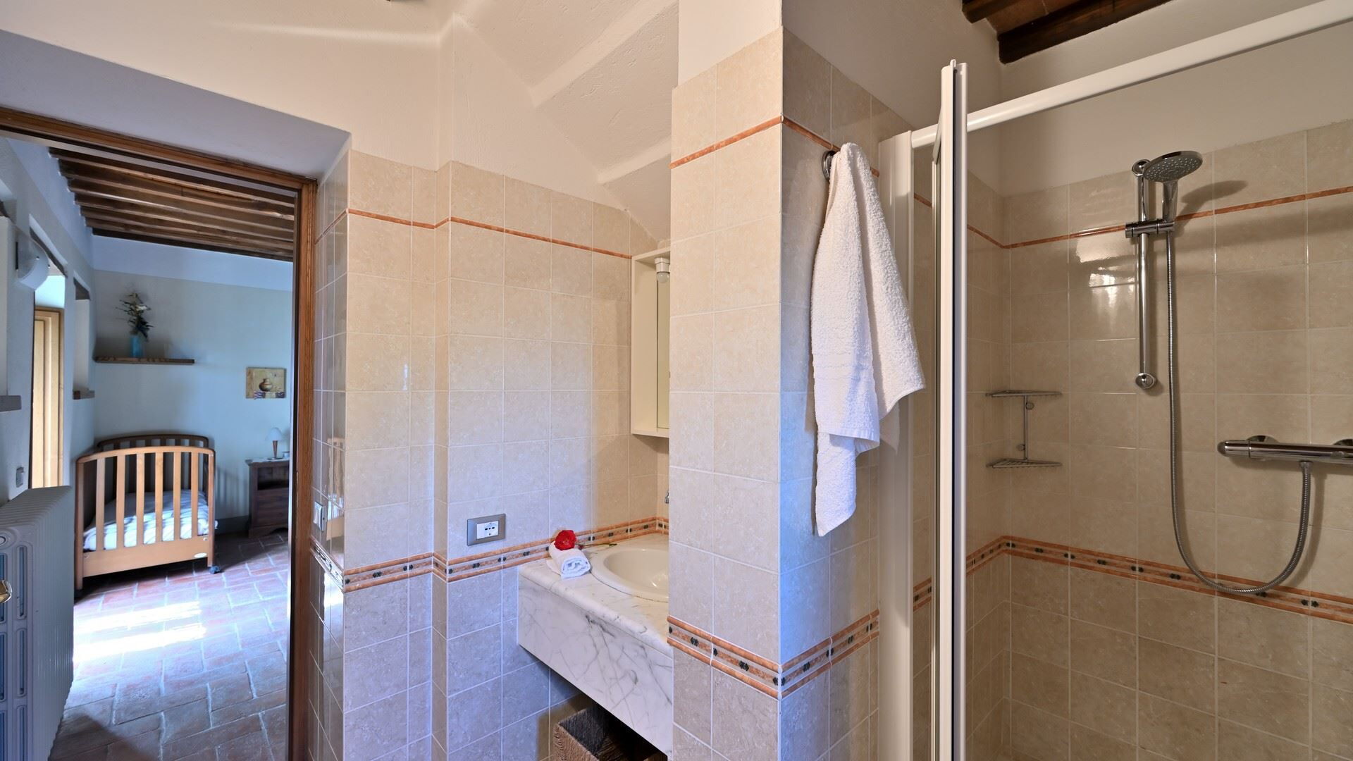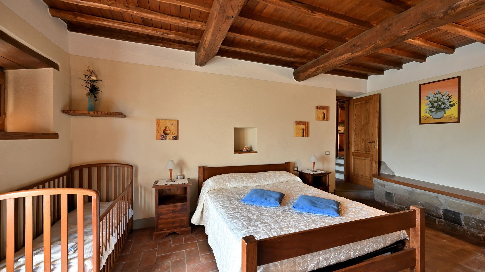 Slaapkamer met badkamer: tweepersoonsbed, baby wieg, ventilator, toilet , bidet, haardroger, uitgang naar de tuin.