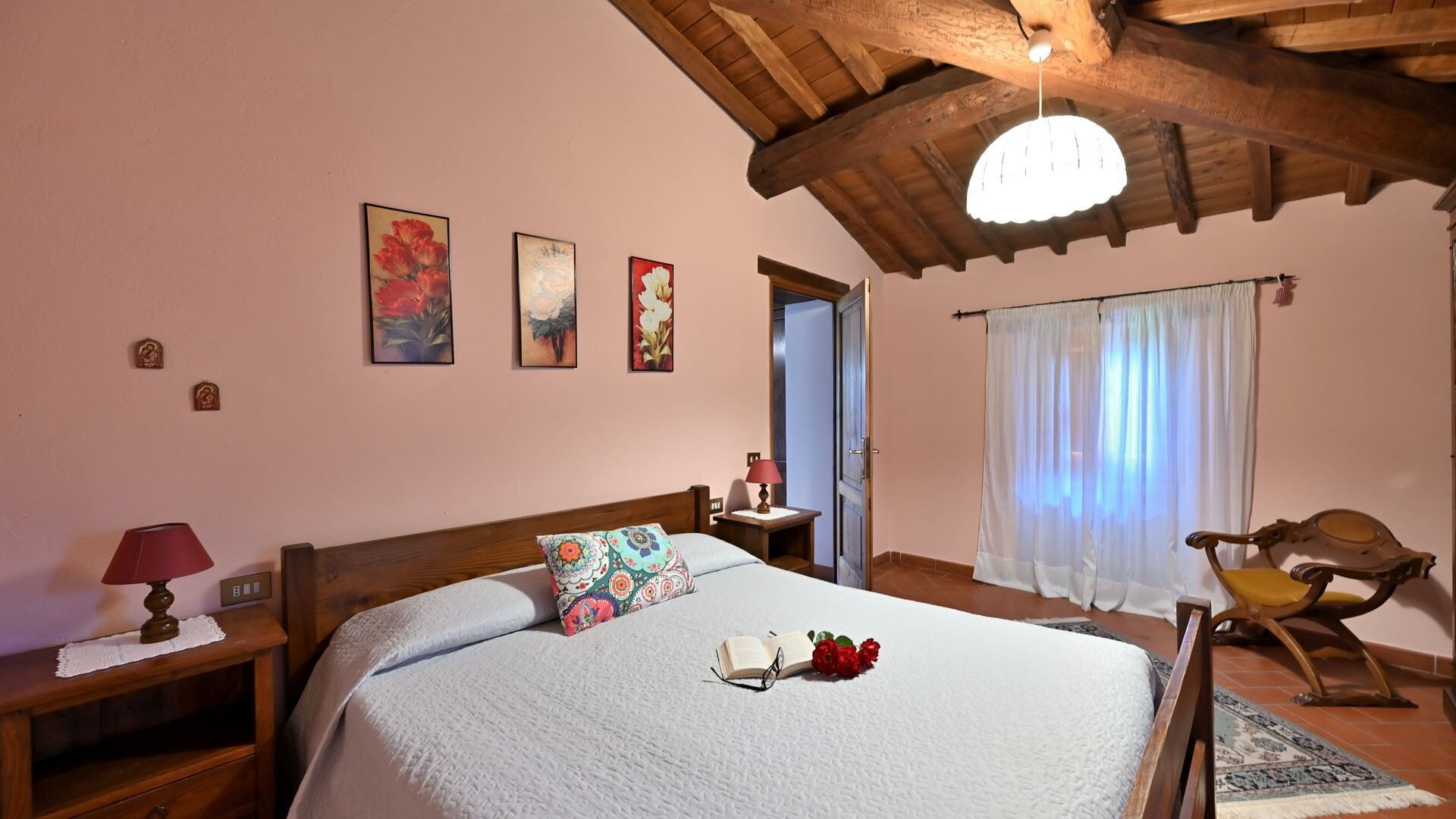 Slaapkamer: tweepersoonsbed, ventilator, uitgang naar de tuin.