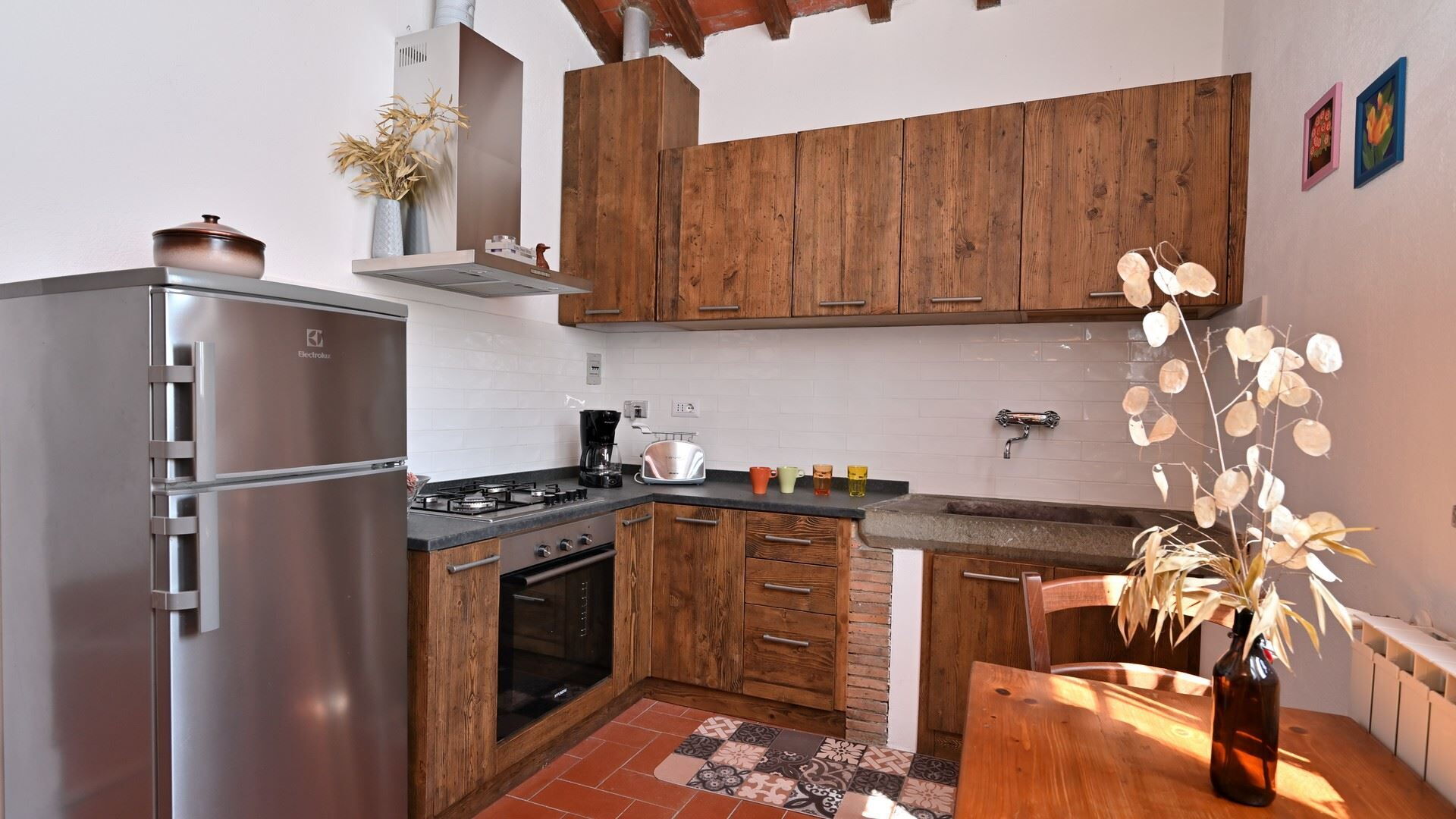 Keuken – woonkamer: goed uitgeruste keuken, eettafel, ijskast, diepvriezer, kookplaat, oven, broodrooster, italiaans koffiezetapparaat, koffiezetapparaat, bank (personen: 3), open haard, WIFI internet, tv, ventilator, rookmelder, co2 detector, uitgang naar het balkon.