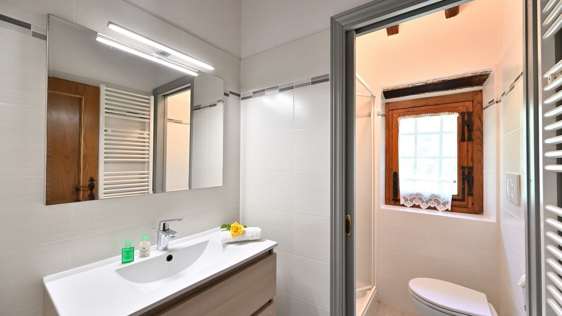Badkamer 1: wastafel, toilet , bidet, douche, haardroger.
