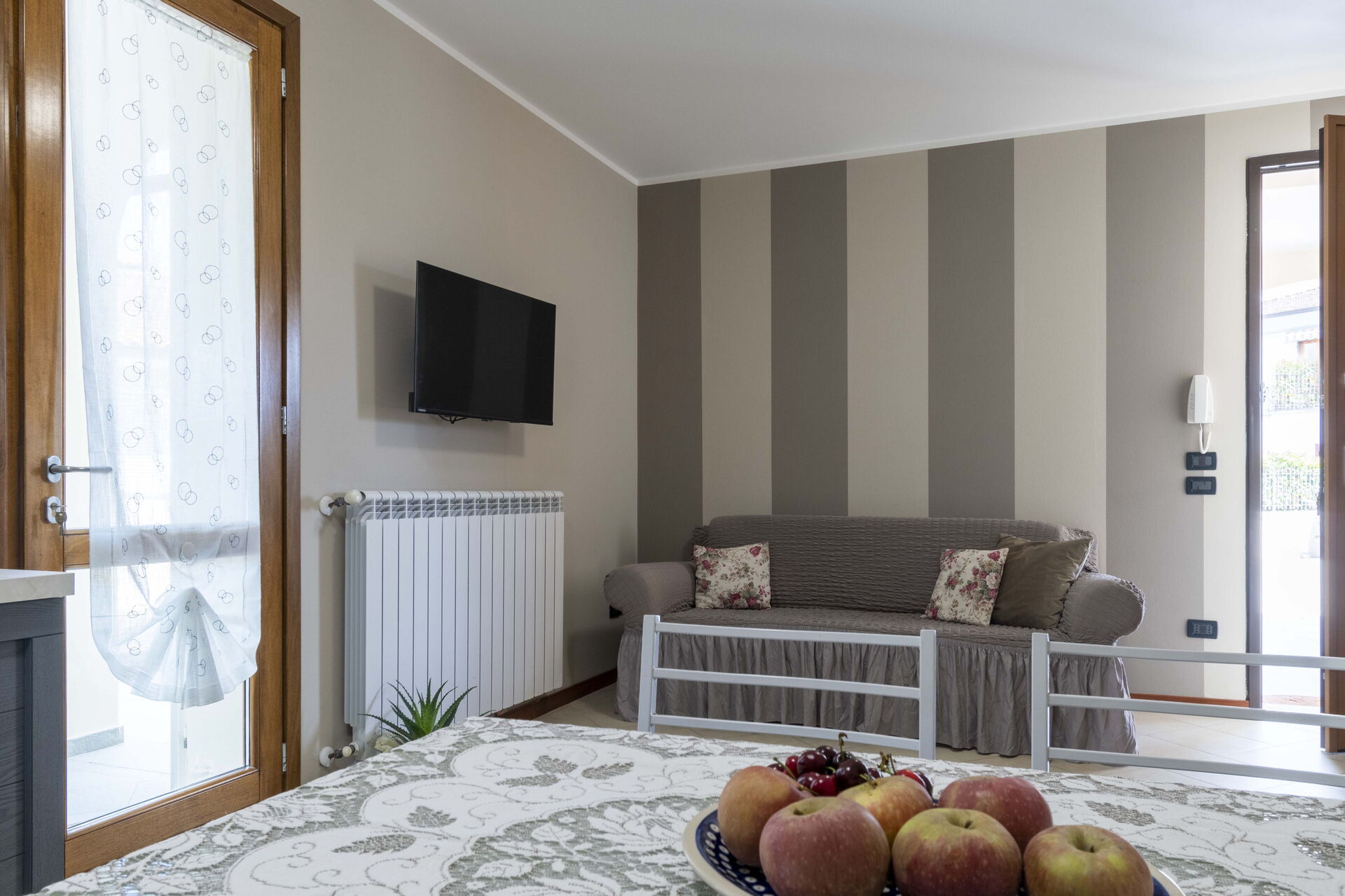 Keuken – woonkamer: goed uitgeruste keuken, eettafel, ijskast, diepvriezer, kookplaat, oven, italiaans koffiezetapparaat, bank, WIFI internet, airconditioning, satelliet tv, uitgang naar de tuin.