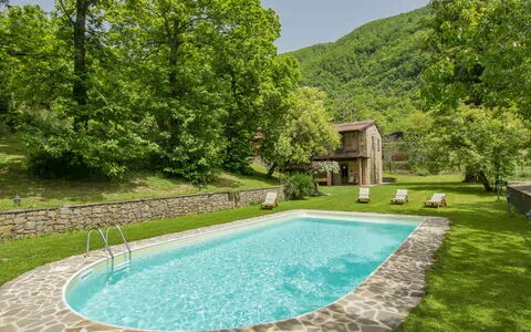 Groot, gezellig landhuis "La Moscella", 555 m boven zeeniveau, bouwjaar 1800, gerenoveerd in 2006, omgeven door bomen en weiden. Voor alleengebruik: wild terrein 500 m2 (omheind), mooie tuin ter ontspanning, openluchtzwembad (11 x 6 m, seizoensgebonden beschikbaarheid: 15.Mei. - 30.Sep.). Buitendouche, terras, tuinmeubelen, barbecue. Kok op verzoek (extra). In de winter sneeuwkettingen aanbevolen. Parkeerplaats (voor 6 auto's) op het terrein. Winkel 5 km, levensmiddelenwinkel 5 km, supermarkt 5 km, restaurant 5 km, bar 5 km, bakkerij 5 km, bushalte 600 m. Attracties in de buurt: Parco Nazionale dell' Orecchiella 3 km, La Fortezza delle Verrucole Archeo Park 4 km, Parco Avventura Il Buffardello 3 km. Auto noodzakelijk. Baby uitrusting op aanvraag (incl.).