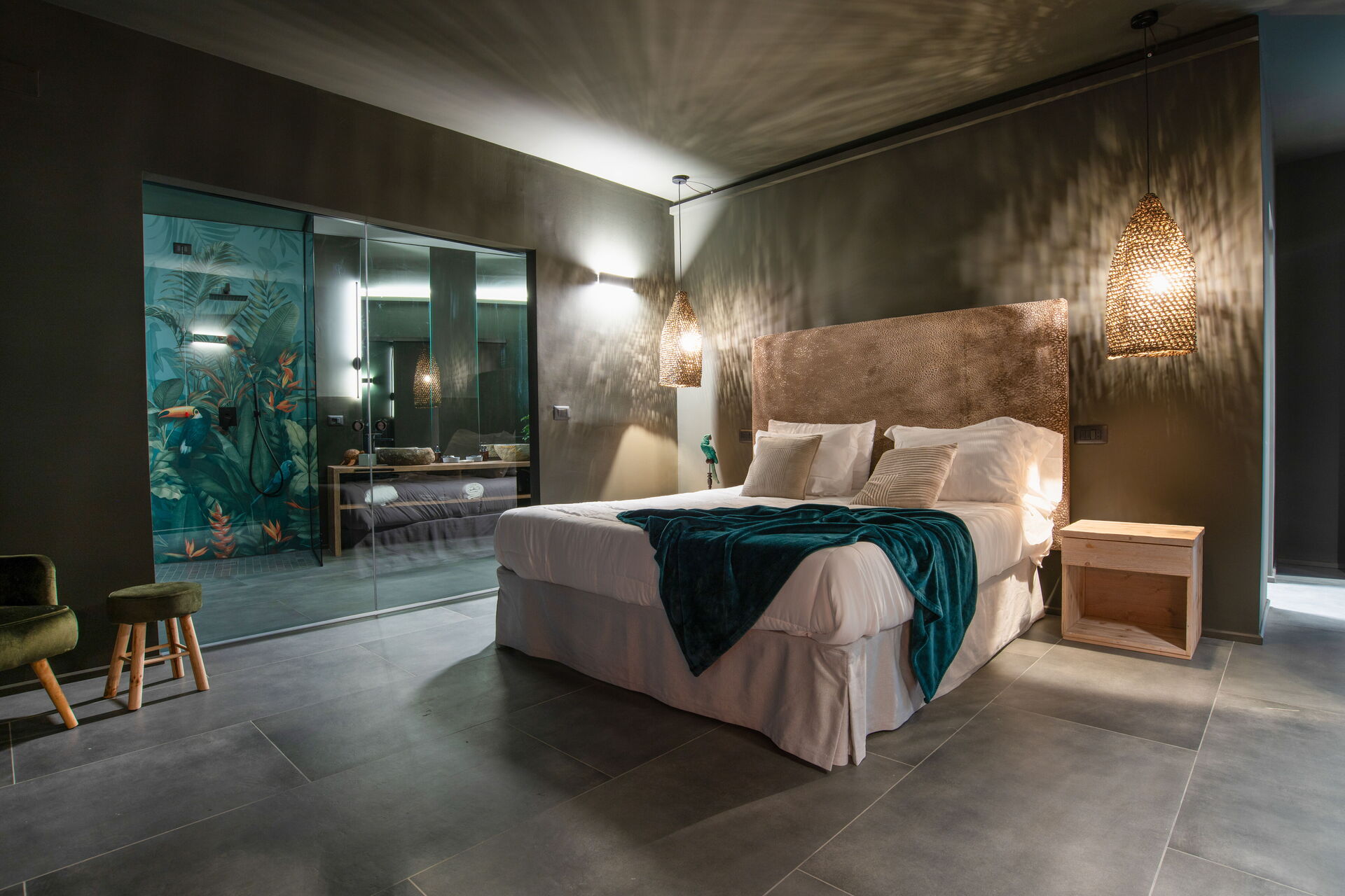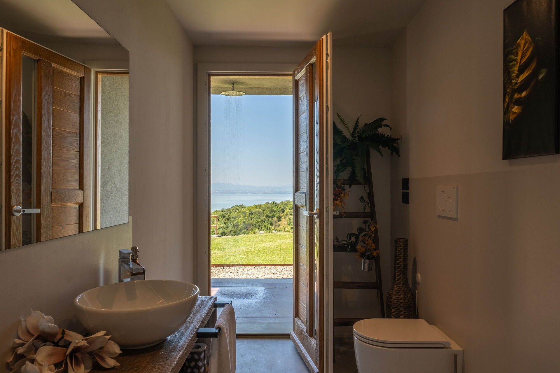Slaapkamer met badkamer 2: tweepersoonsbed, WIFI internet, airconditioning, fauteuil, bureau, wastafel, toilet , bidet, douche, haardroger, uitgang naar de tuin.